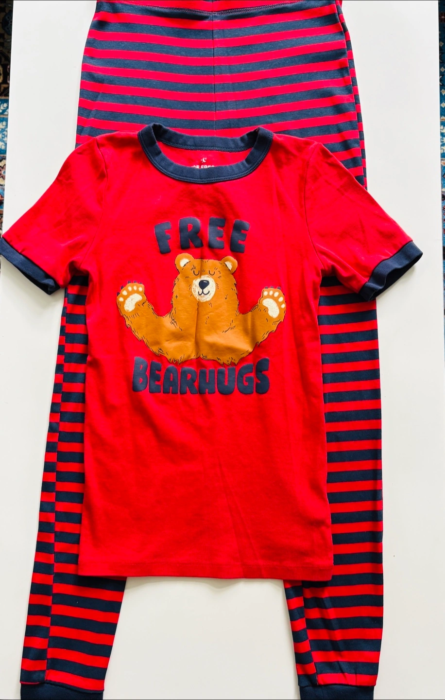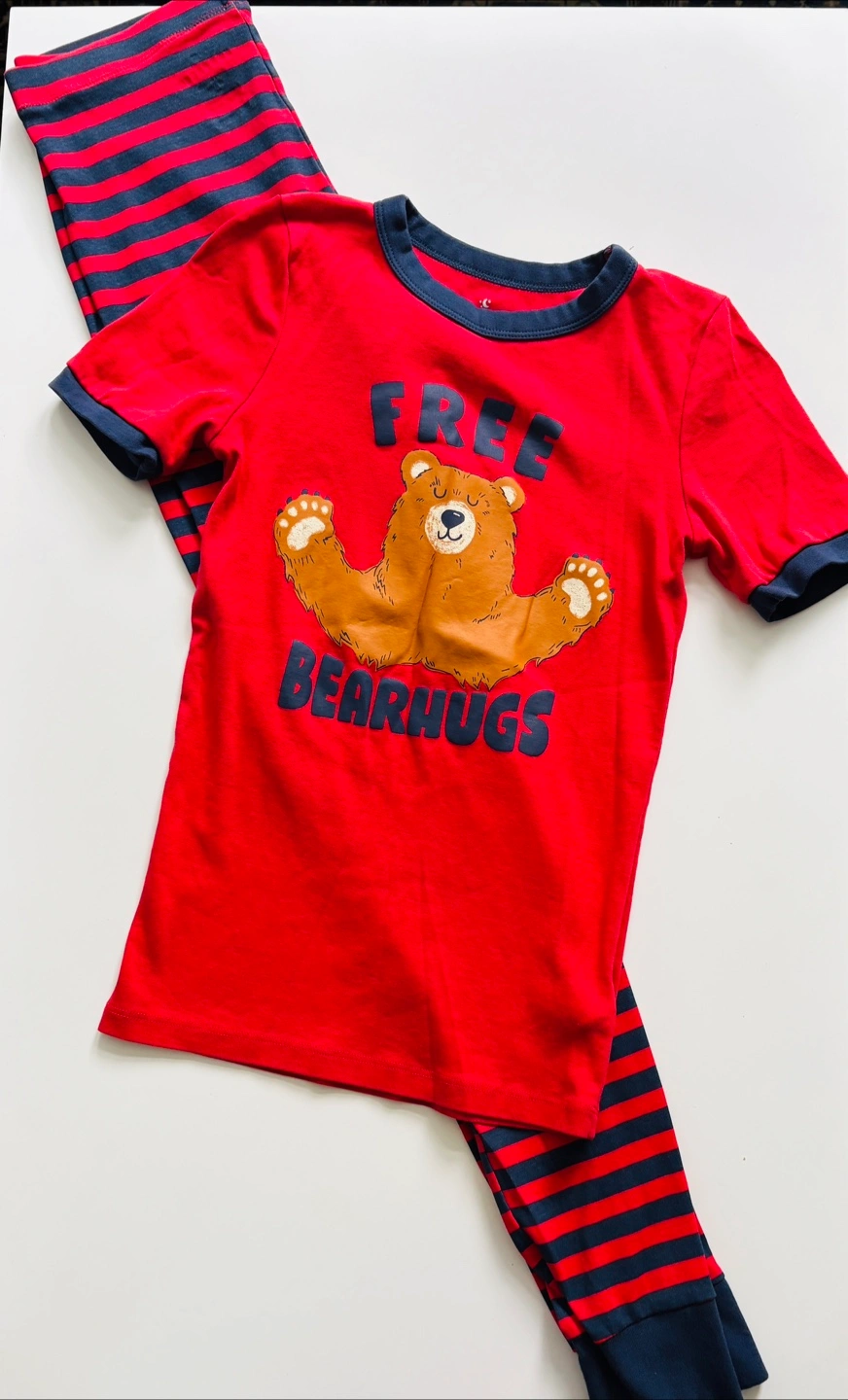 A cute and comfy Joe Fresh pajama set featuring a red top with a bear hug design and striped bottoms. Perfect for a cozy night's sleep!