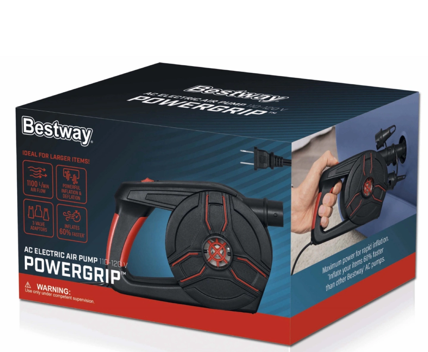 Inflate your inflatables quickly with this brand new Bestway Powergrip AC electric air pump, designed for larger items with a high air flow of 1100 L/min and inflates 60% faster.