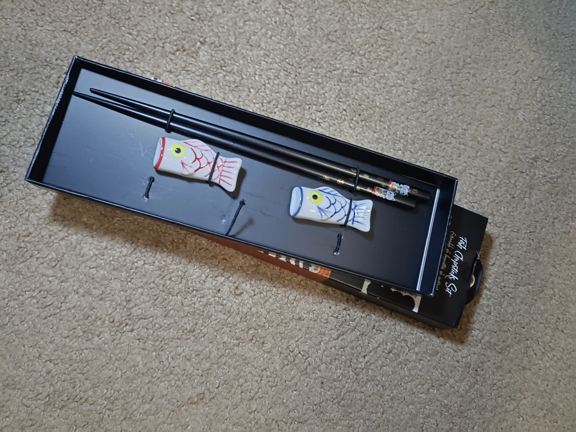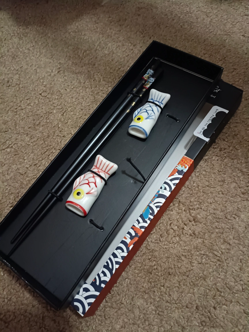 Here's a cute fish chopstick set! It comes with two pairs of chopsticks and chopstick rests in a box. Perfect for adding a touch of whimsy to your dining table