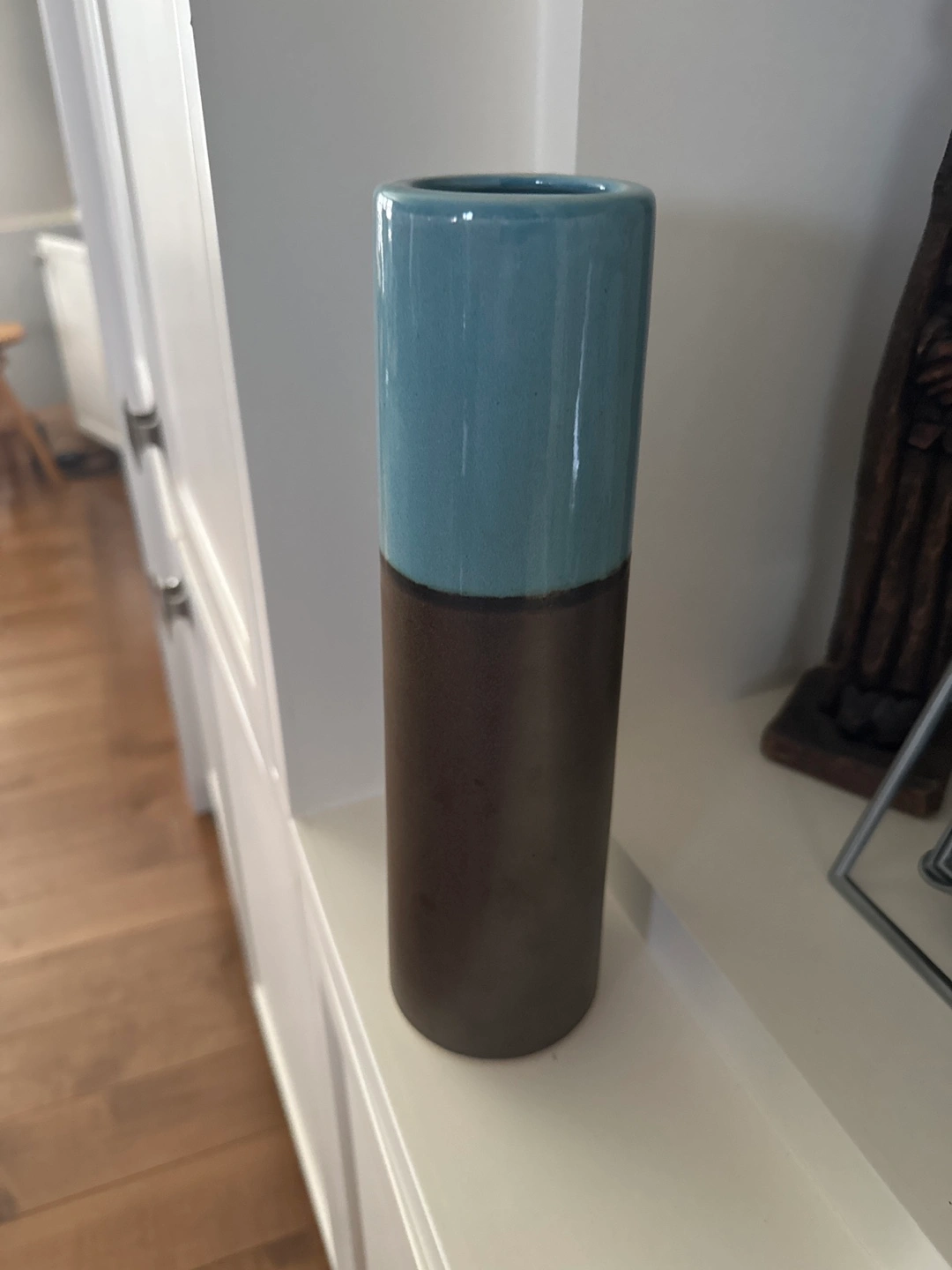 Selling a lovely two-tone ceramic vase. It features a light blue top and a dark brown bottom. Perfect for adding a touch of colour to any room!