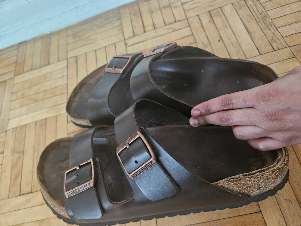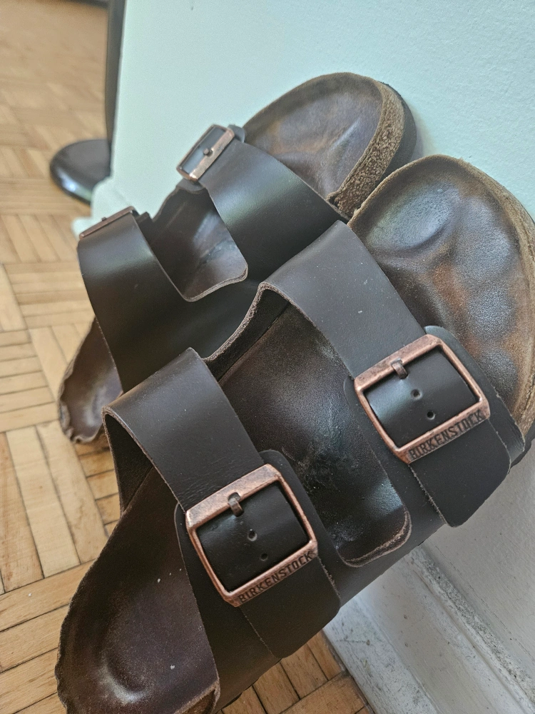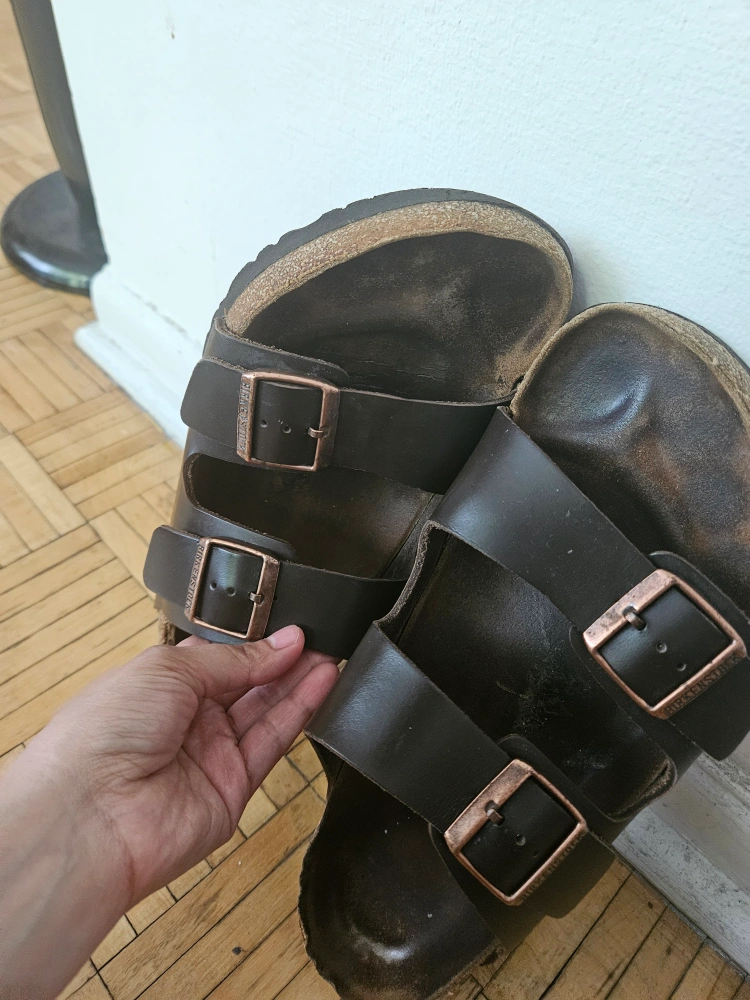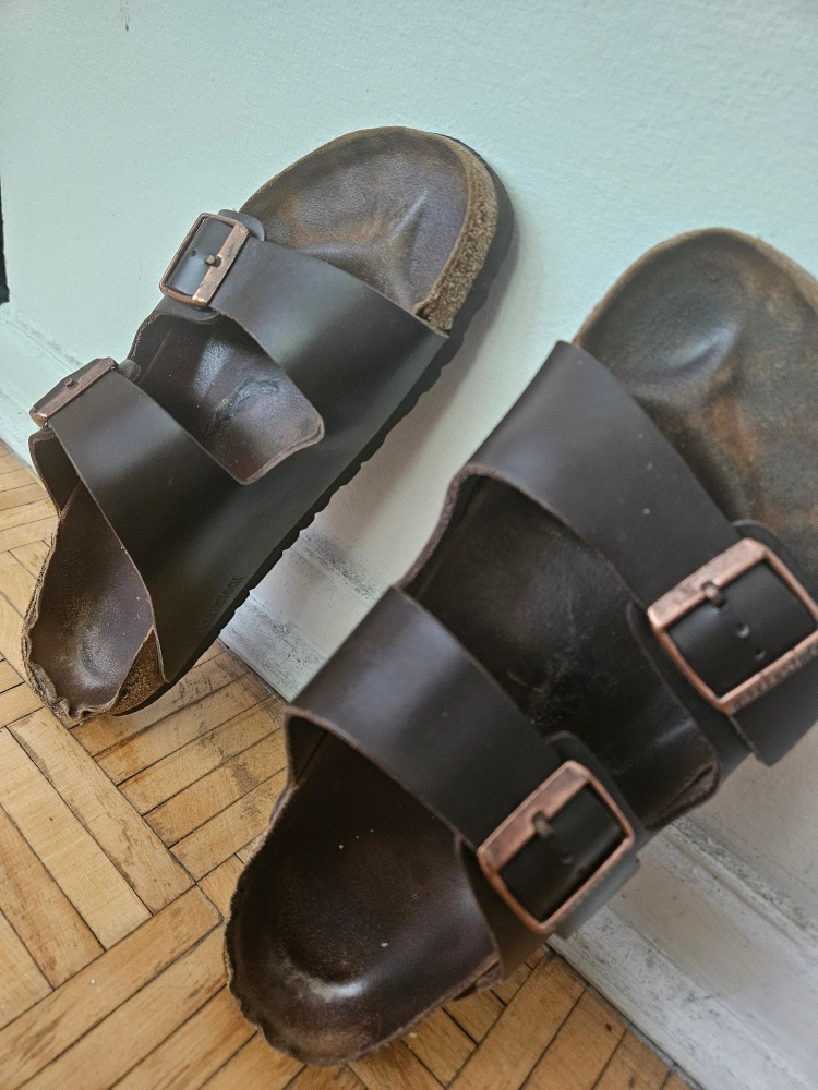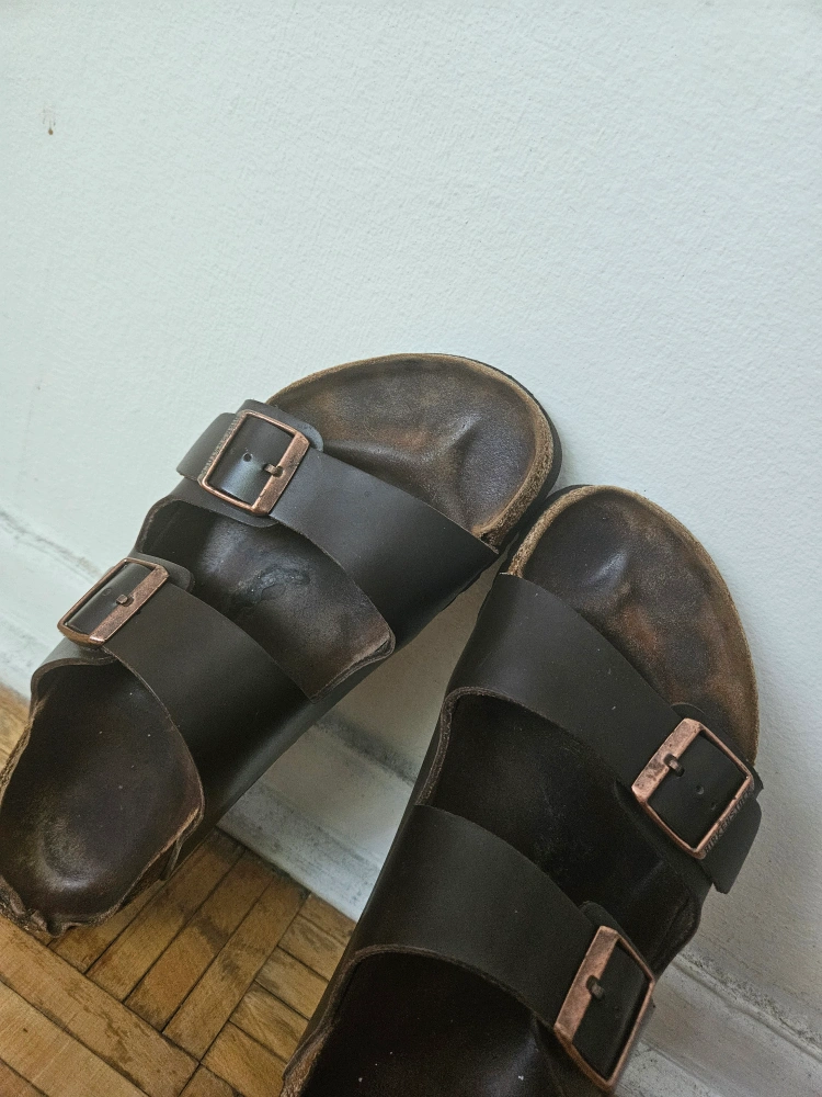 Here are some well-loved Birkenstock Arizona sandals! They feature a dark brown leather upper and adjustable straps for a comfy fit. These sandals are ready for new adventures!
