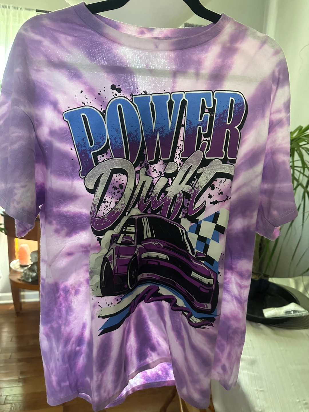 This is a purple tie-dye t-shirt with a car graphic on it. The shirt says "Power Drift" in a stylized font. It's in great condition and ready for a new home!