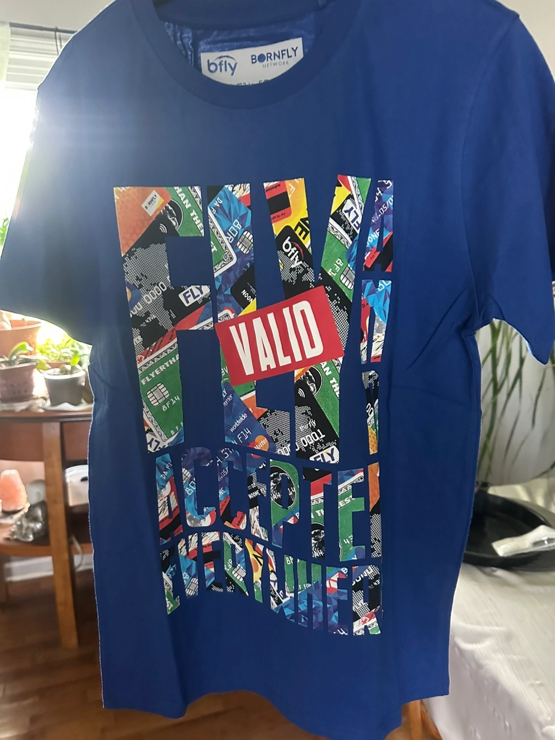 Selling a blue BFLY t-shirt with a cool graphic design! The shirt features a unique pattern with the word 'FLY' and the brand name incorporated into the design. It's in great condition and ready for a new home!