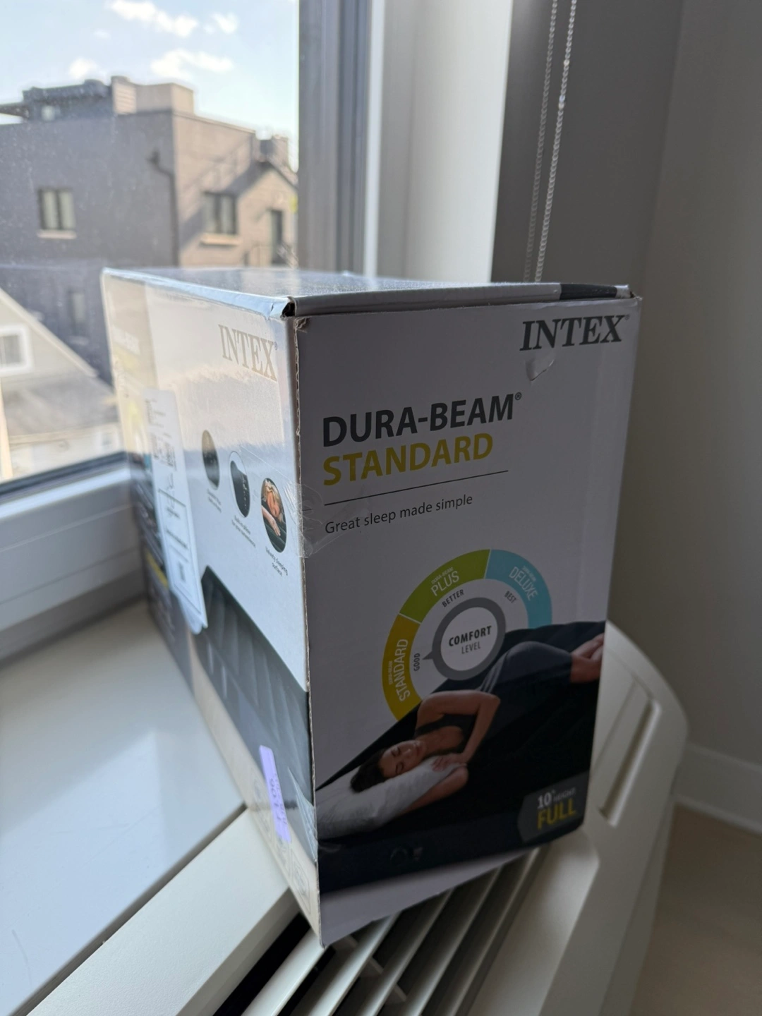 Selling a full-size Intex Dura-Beam Standard Pillow Rest Classic Air Mattress! It's 10" in height and comes sealed in its original box. This air mattress features Dura-Beam construction and Fiber-Tech beam tops for a supportive and comfortable sleeping surface. Great for guests or camping!