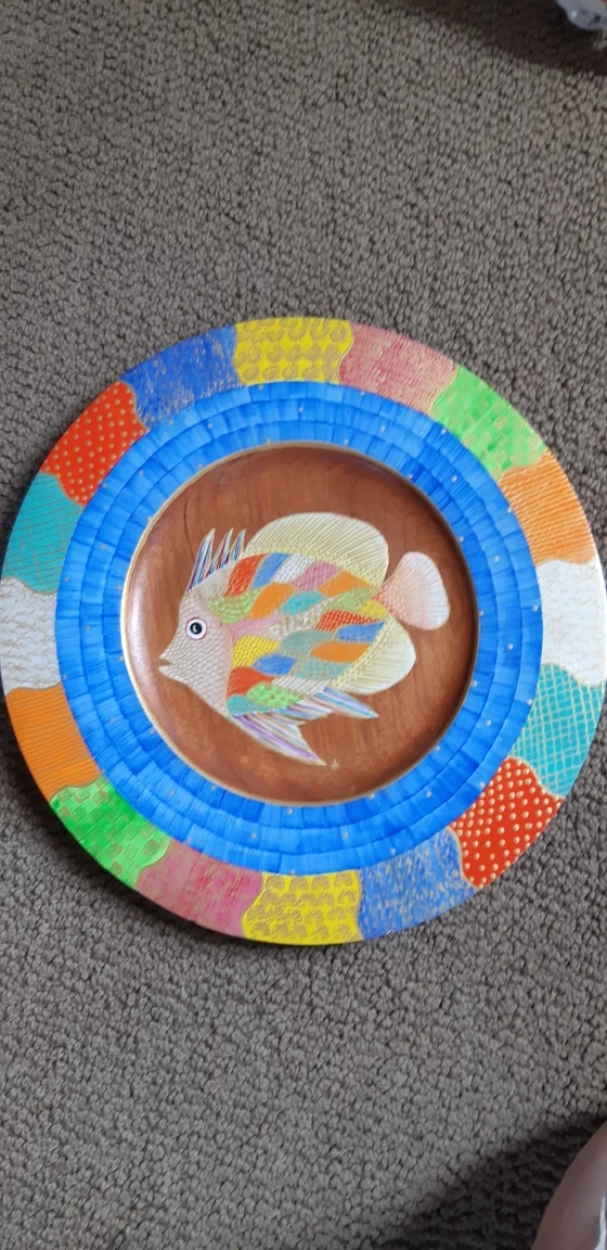 Beautiful mahogany plate, hand-painted by Bibi Leon