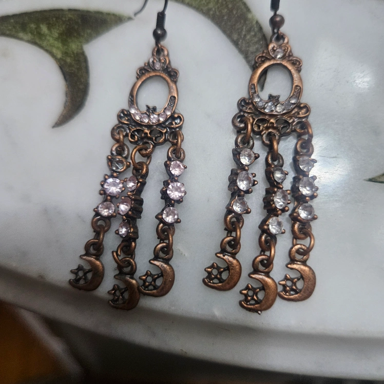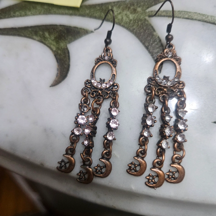 Beautiful dangle earrings with an Art Deco design! These copper-colored earrings feature intricate details and a unique style that's sure to catch the eye