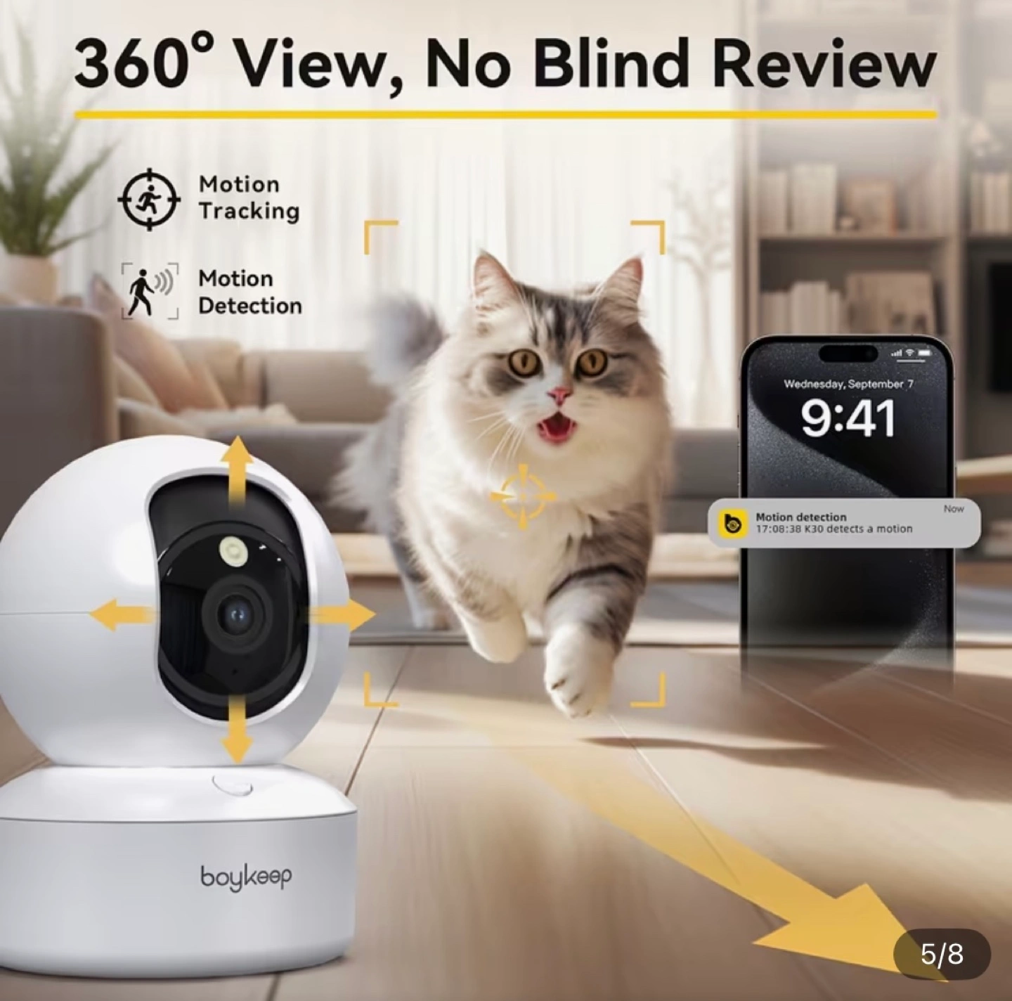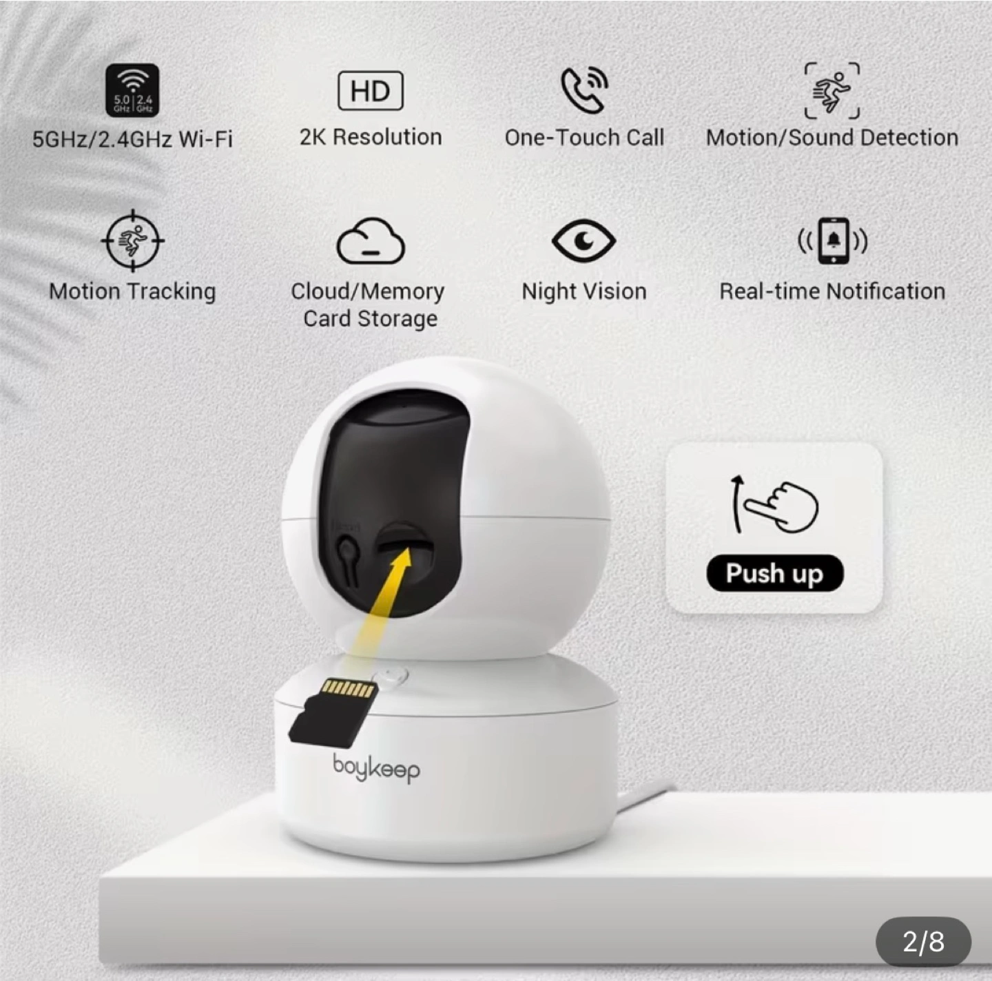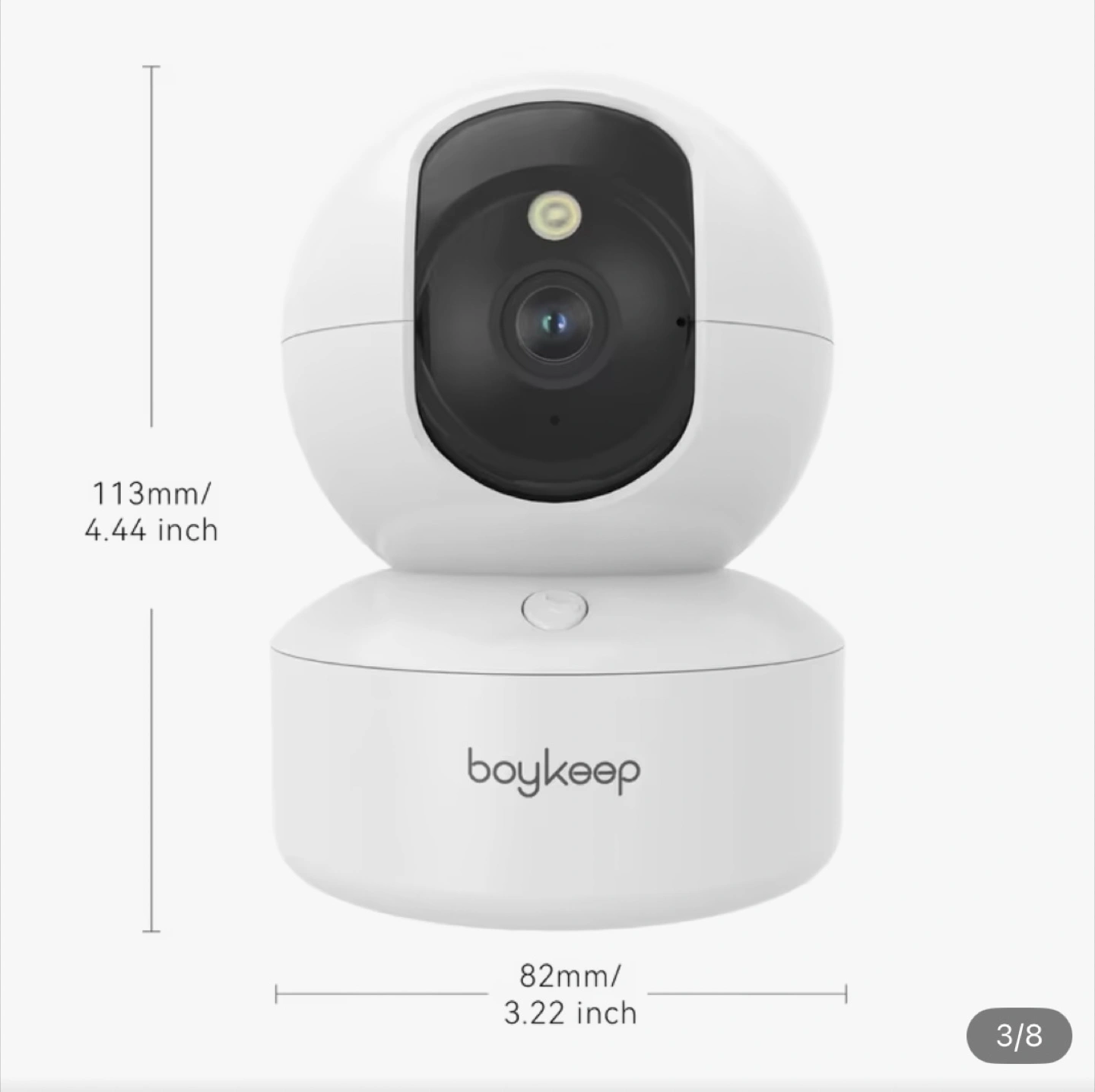 Selling a Boykeep smart camera. It features 2K resolution, one-touch call, and motion/sound detection. It also has motion tracking, cloud/memory card storage, night vision, and real-time notifications. The camera supports 5GHz/2.4GHz Wi-Fi. Dimensions are 113mm/4.44 inch height and 82mm/3.22 inch base diameter