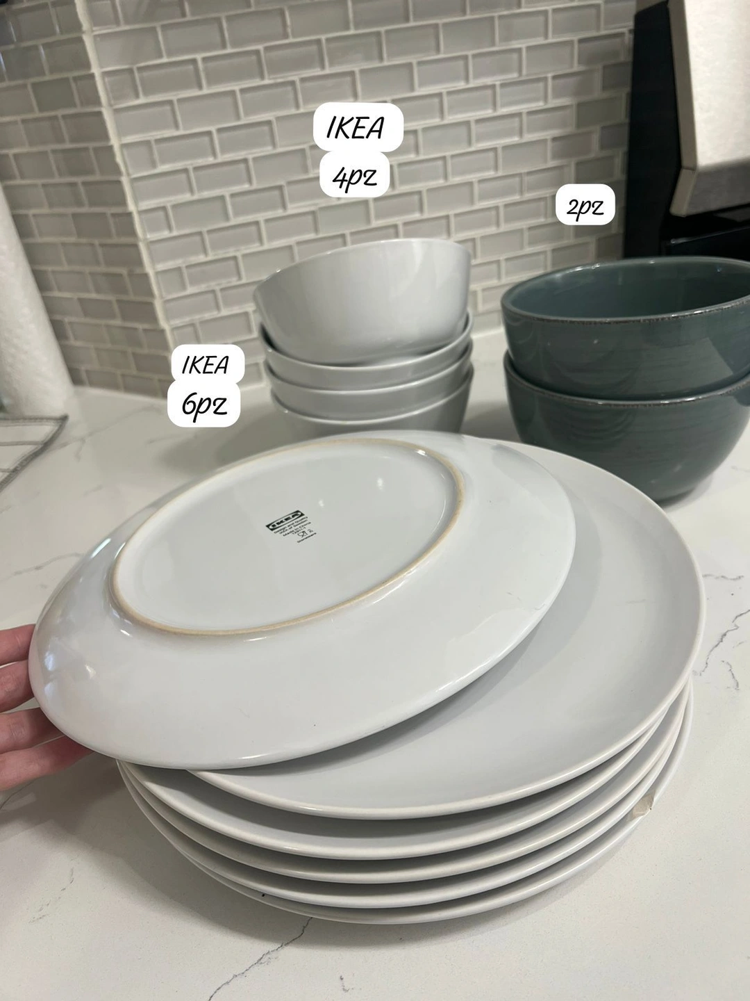 Includes 6 white dinner plates, 4 white bowls, and 2 teal bowls.