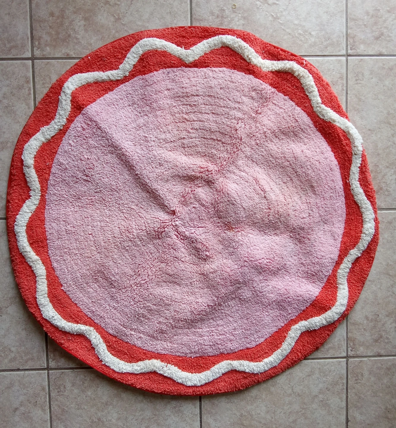 Soft, round bath mat rug with a scalloped edge design. It's a plush, absorbent material. This mat is great for adding comfort to any room!