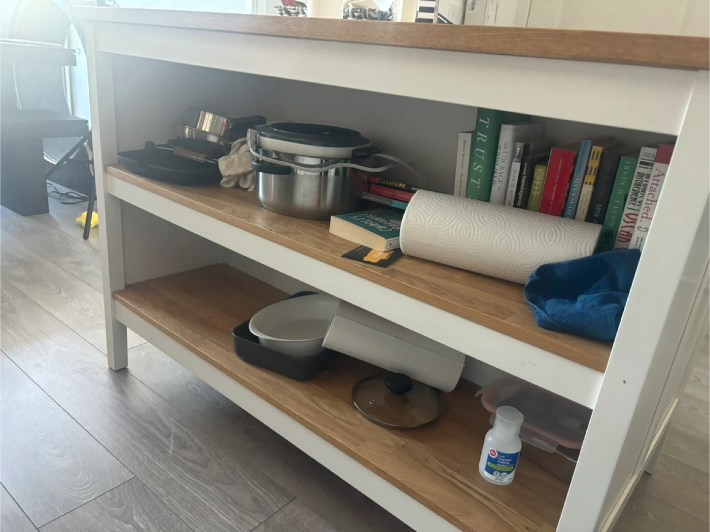 This kitchen island features a sturdy wooden countertop and a white base with open shelving. It's perfect for adding extra prep space and storage to your kitchen. The shelves can hold cookware, books, or decorative items.