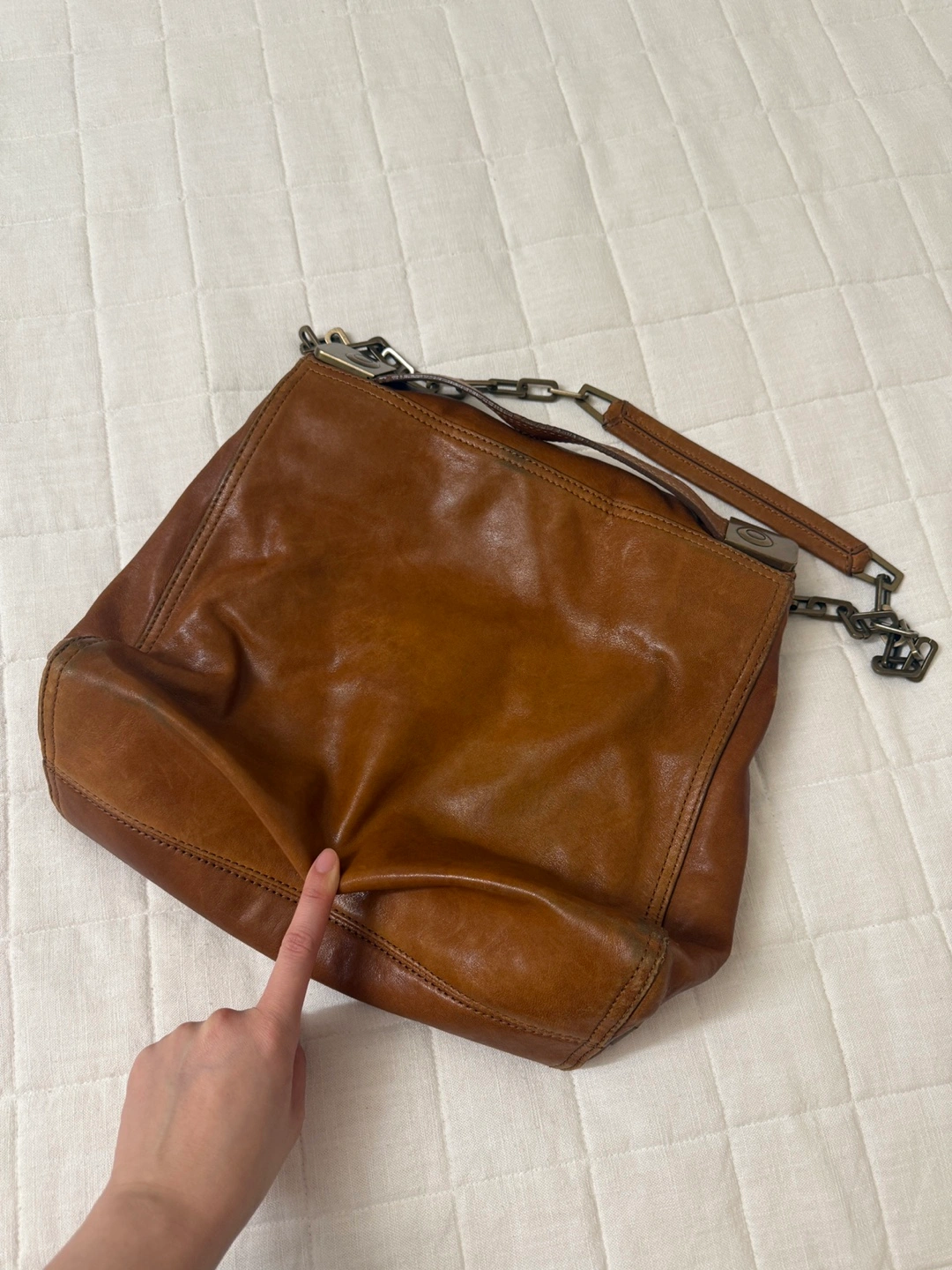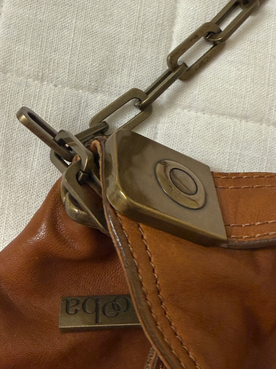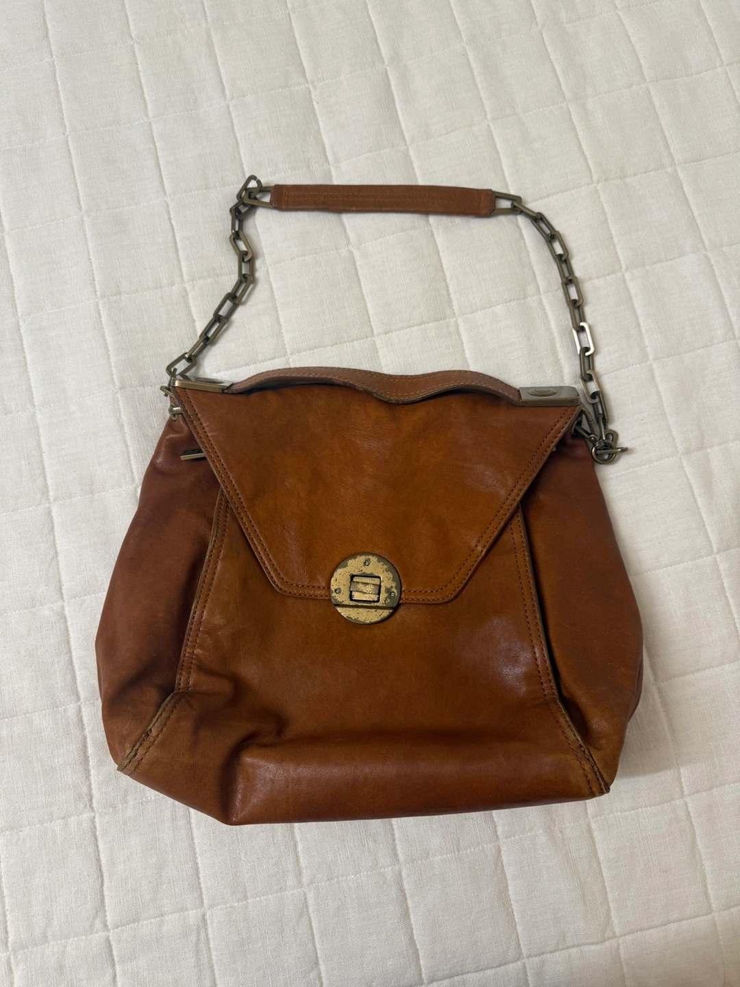 Selling a kooba brown leather shoulder bag. It shows some signs of wear, as you can see in the pictures, but it's still a stylish bag with a unique chain detail. The leather has a nice, worn-in look. Perfect for everyday use!