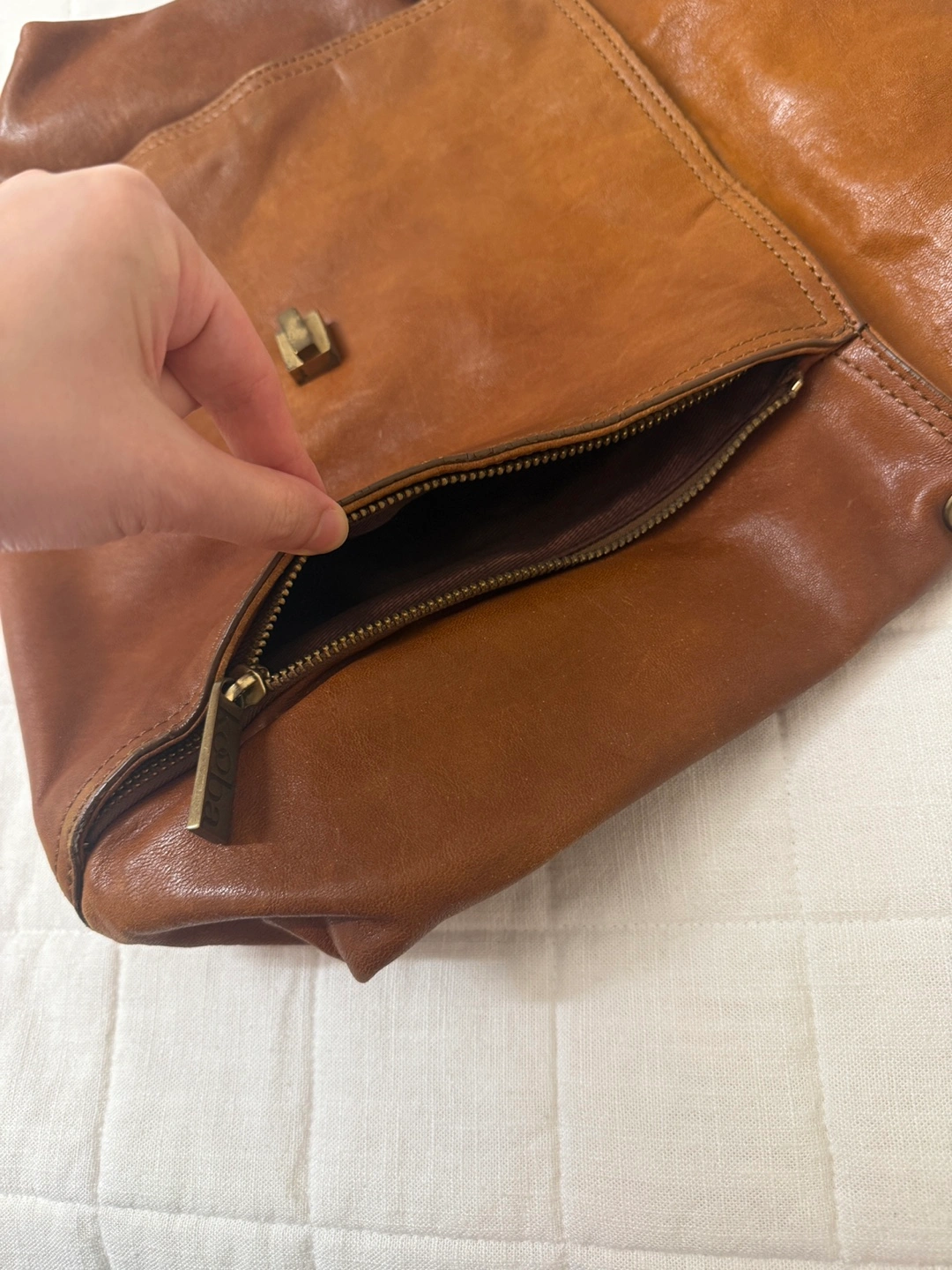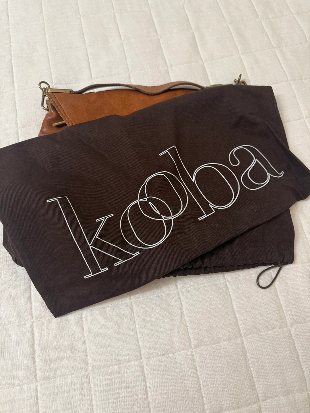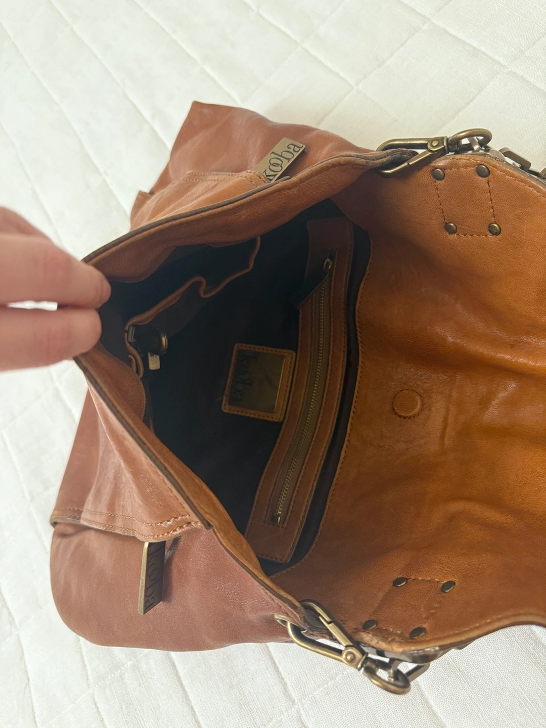 Selling a kooba brown leather shoulder bag. It shows some signs of wear, as you can see in the pictures, but it's still a stylish bag with a unique chain detail. The leather has a nice, worn-in look. Perfect for everyday use!