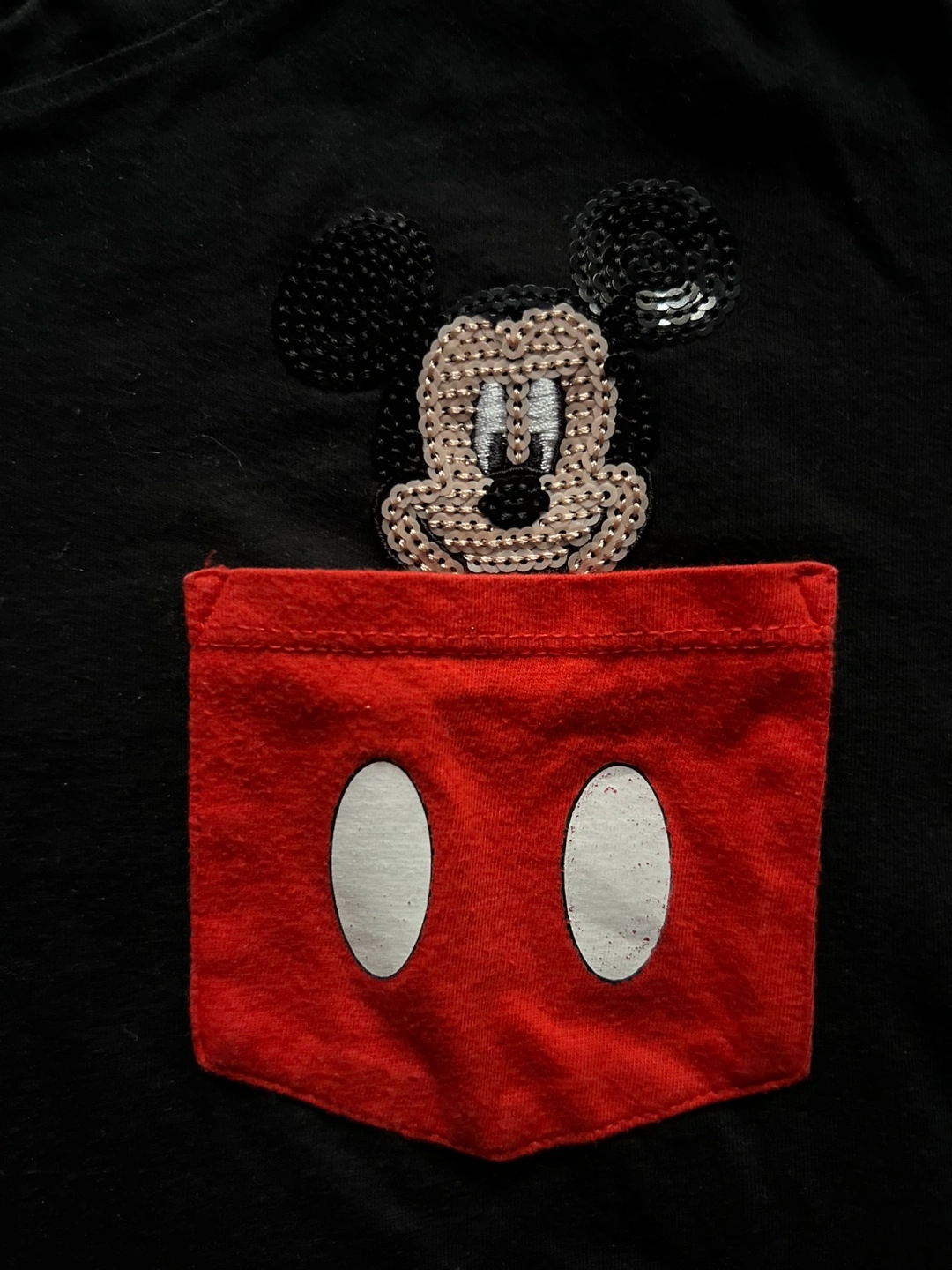 Cute Disney t-shirt featuring Mickey Mouse! It's a black t-shirt with a sequined Mickey Mouse design on the front and a red pocket. The size is M and it's made of 100% cotton
