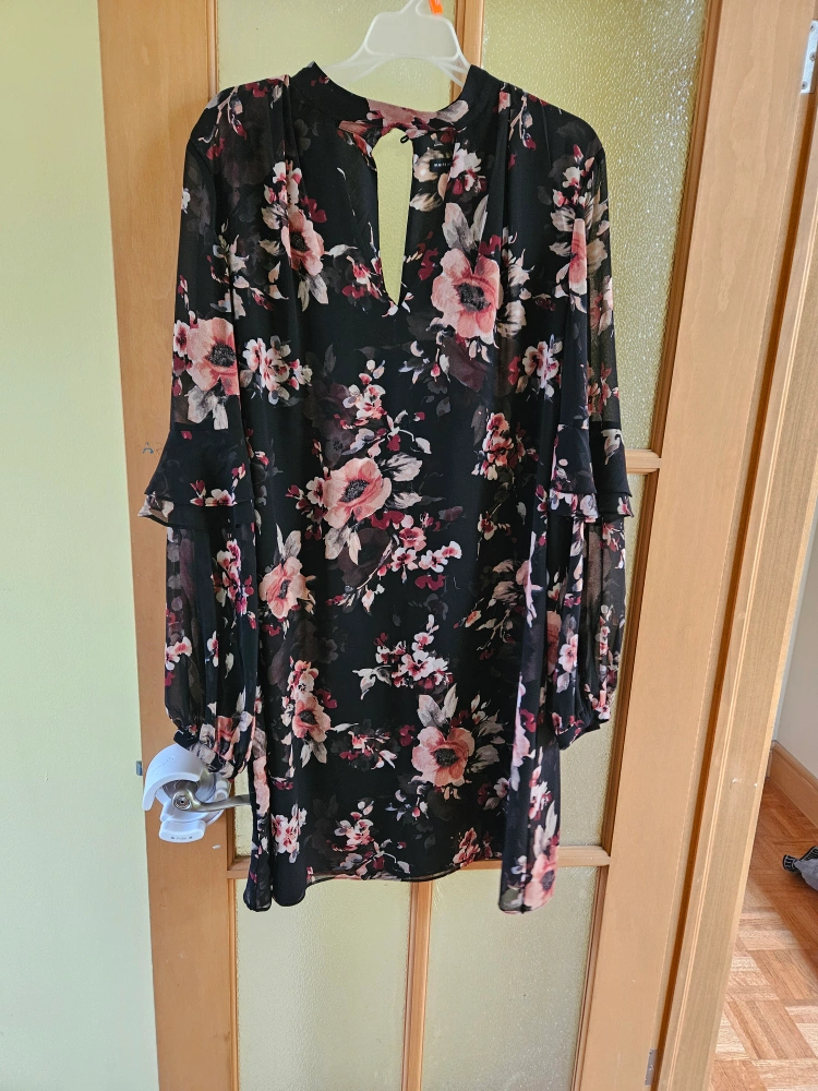 Here's a lovely floral dress from White House Black Market! It features a pretty floral pattern on a black background and long sleeves. Perfect for dressing up or down!