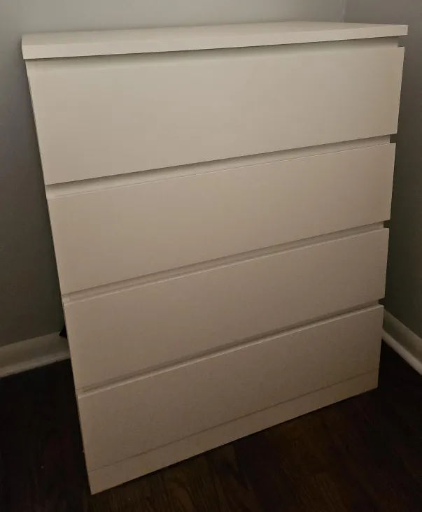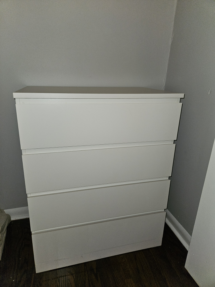 Selling a gently used IKEA MALM dresser with 4 drawers in white. It's in great shape and ready to organize your space! Perfect for bedrooms or closets, this dresser offers ample storage with a clean and simple design.