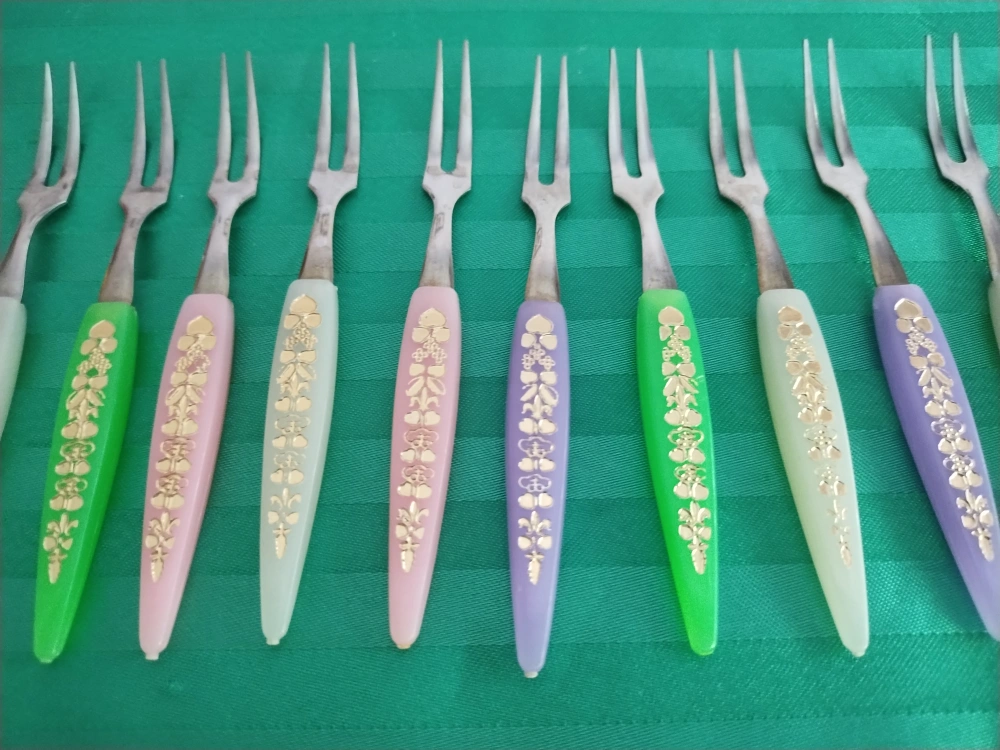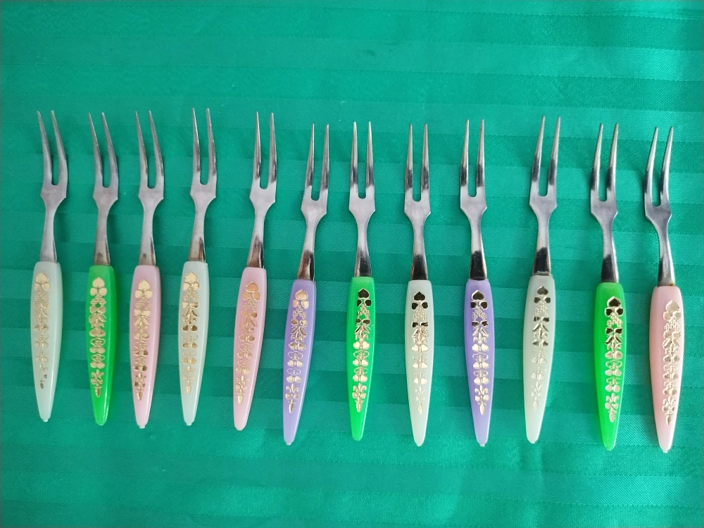 Here are some cute vintage cocktail forks with colourful handles! They feature a lovely floral design in gold. Perfect for serving appetizers or desserts at your next gathering