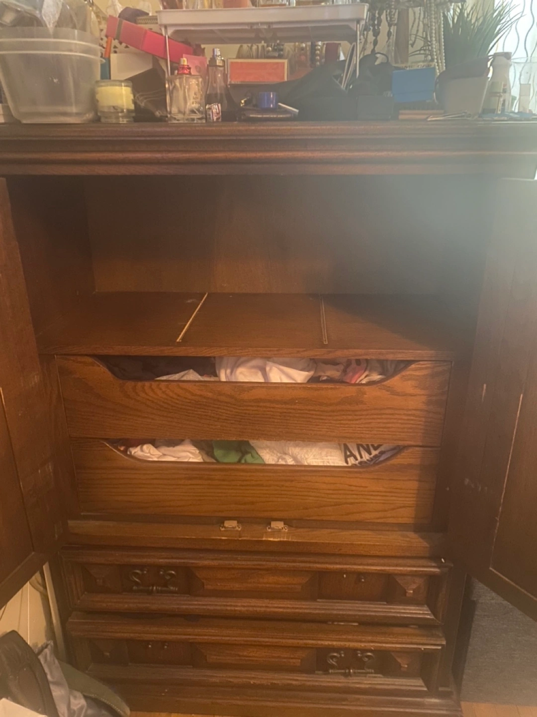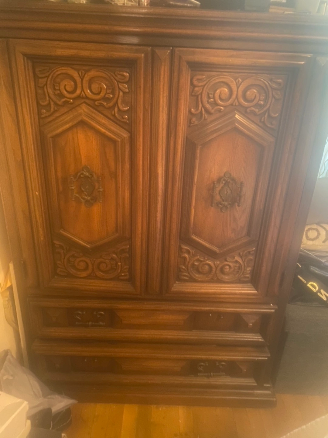 Selling a vintage wooden armoire! It has a unique design with ornate carvings on the doors. It features drawers and cabinet space for storage. Perfect for adding a touch of classic style to your home. Solid wood. There are four large drawers.