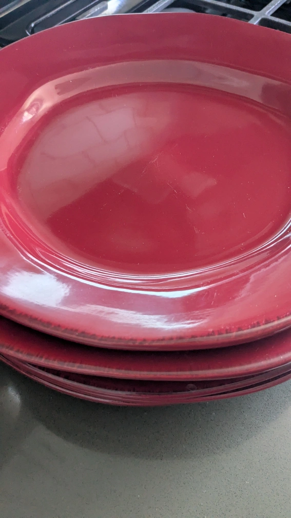 Selling a set of red dinner plates. They are in good condition and ready for a new home! Perfect for adding a pop of color to your dining table