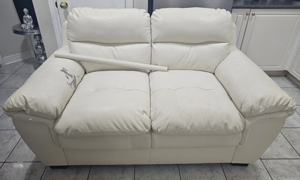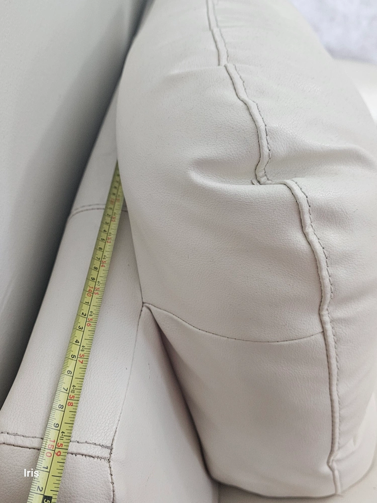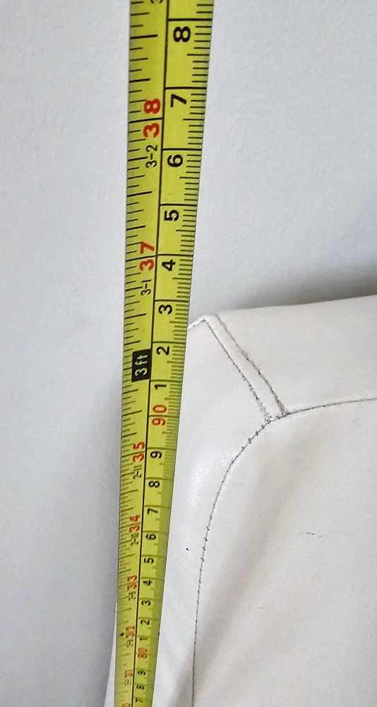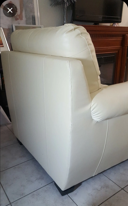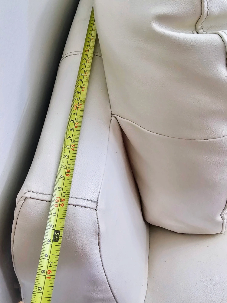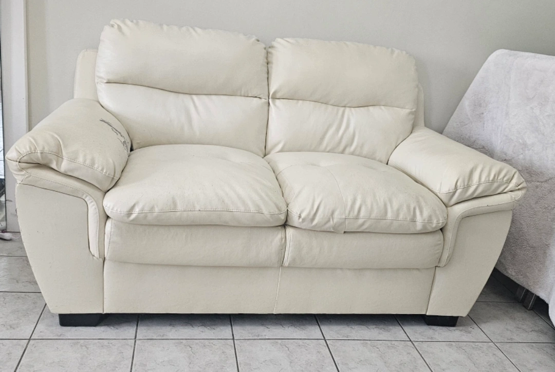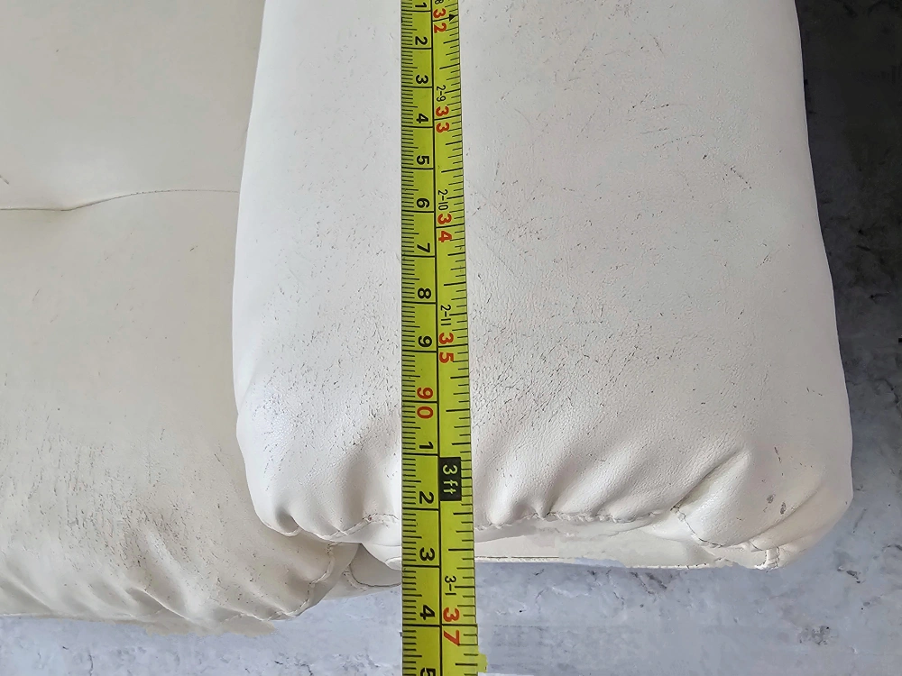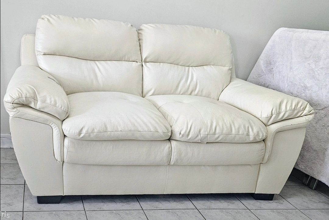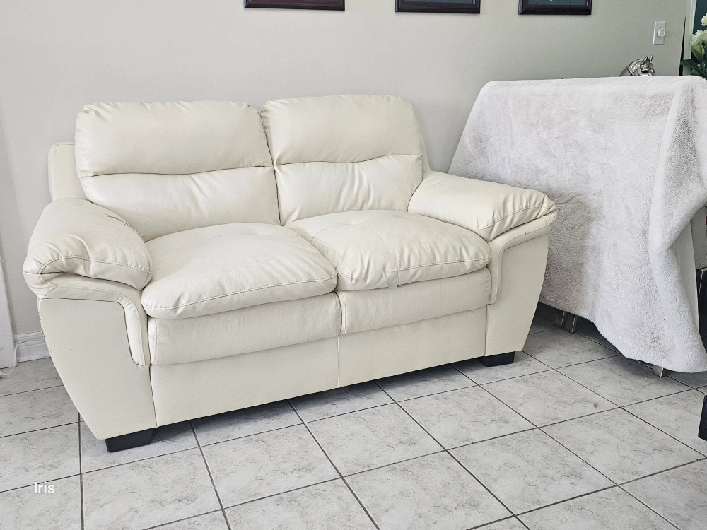 Off White Leather Loveseat Sofa. The sofa is approximately 37 inches in height, 36 in depth and 54 inches in width.