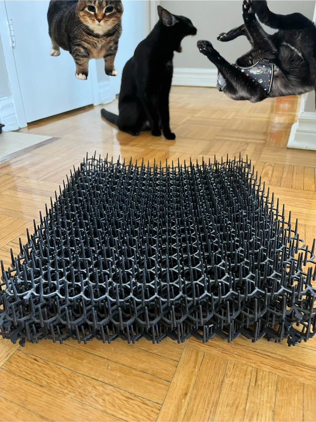 Animal deterrent / bird repellent spikes made of plastic, total of 9 mats and 2 tiny pieces. Used indoors only for my cat who couldn’t care less about spacial boundaries for mere curiosity. Perfect for outdoor use as well. Giving away as my cat and I came to an agreement that I will get rid of these for her smooth under the couch exploration.