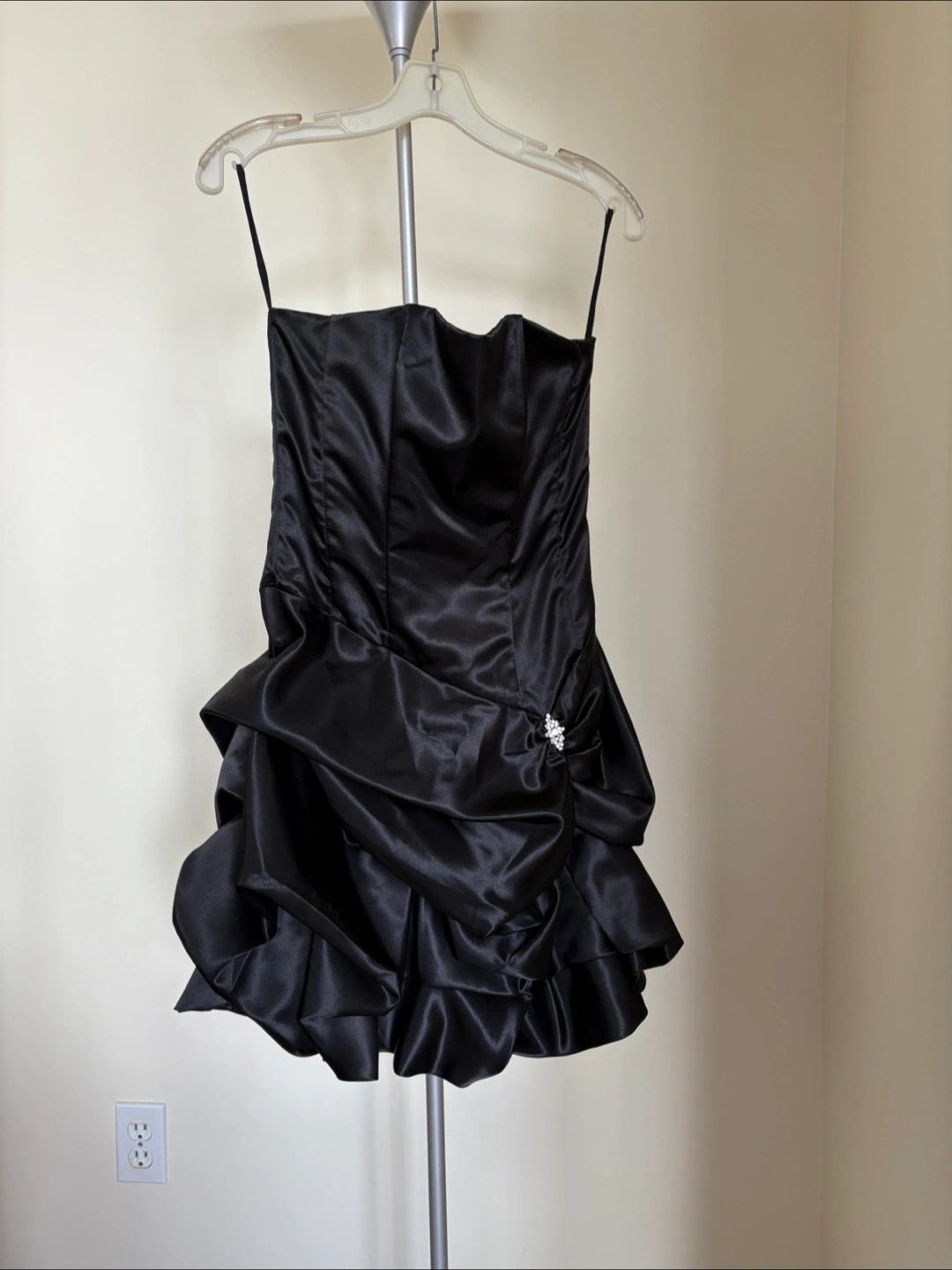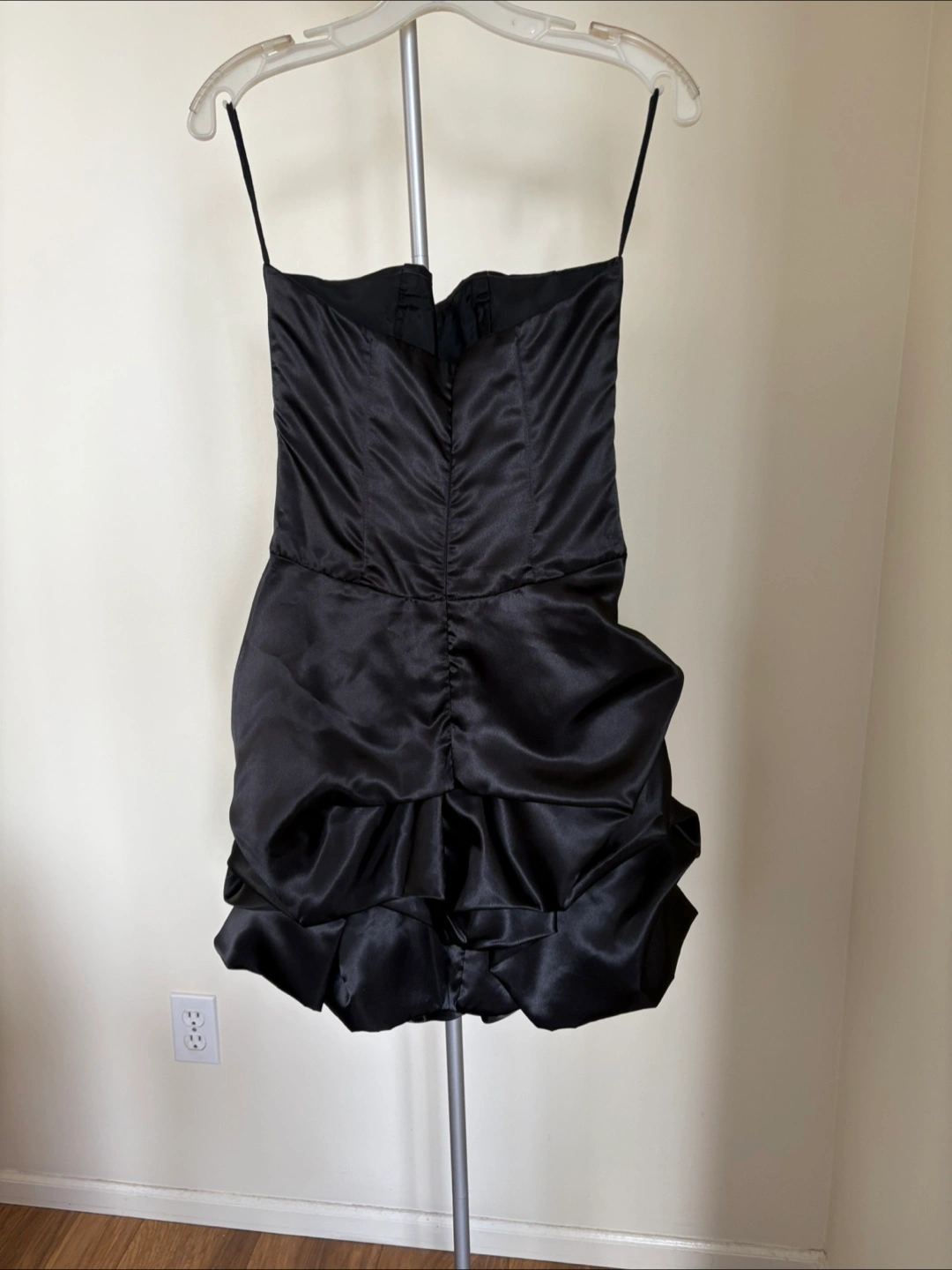 This is a cute black strapless party dress! The material is shiny and the dress has a ruffled skirt. It's in great condition and ready for a night out