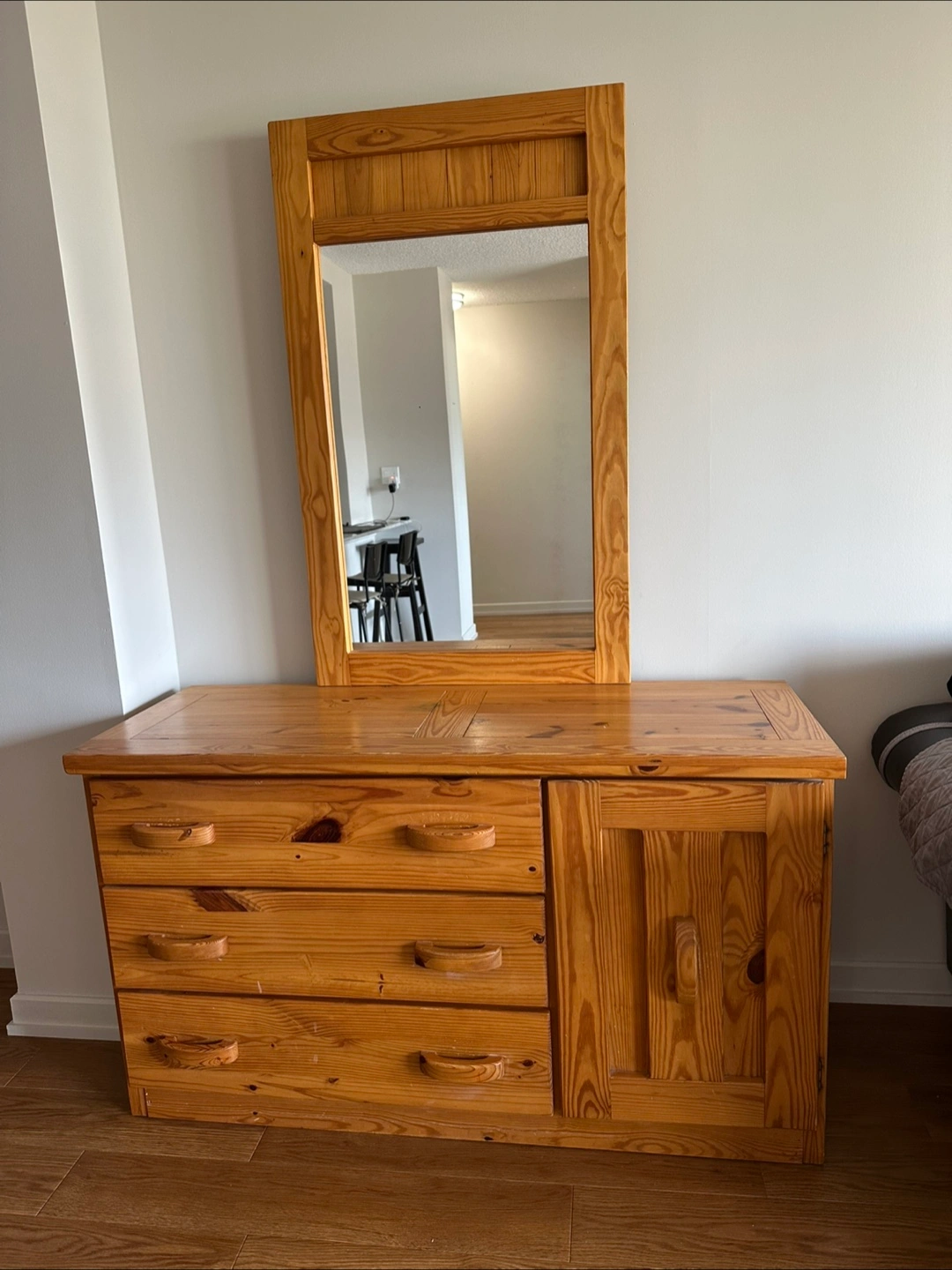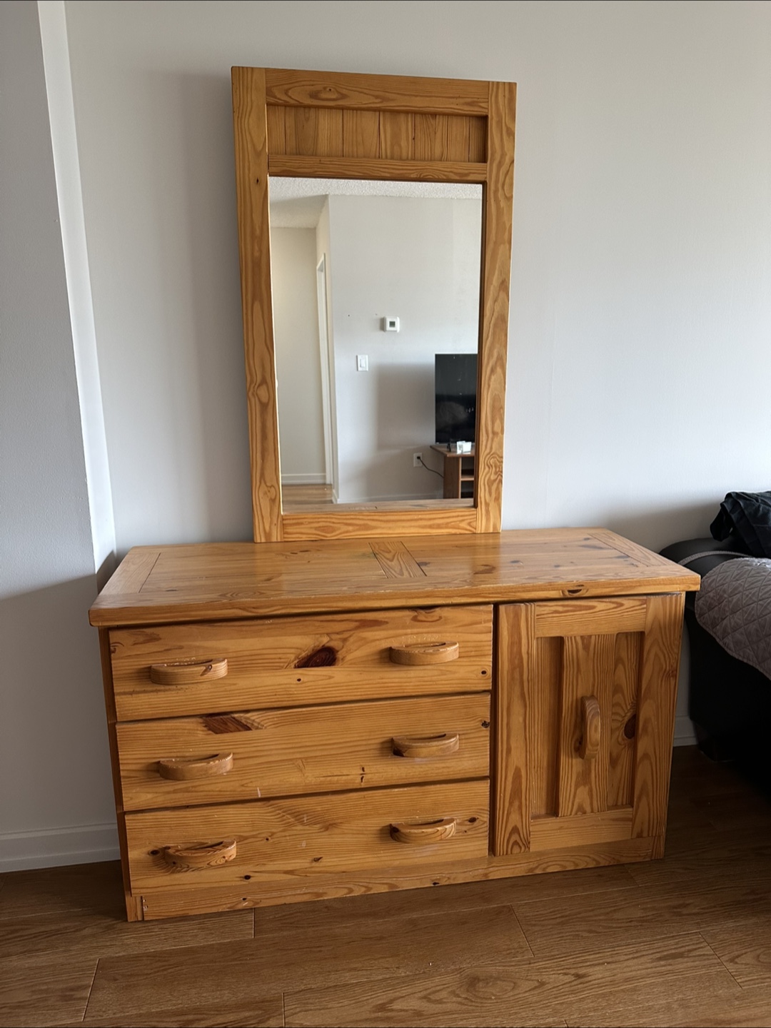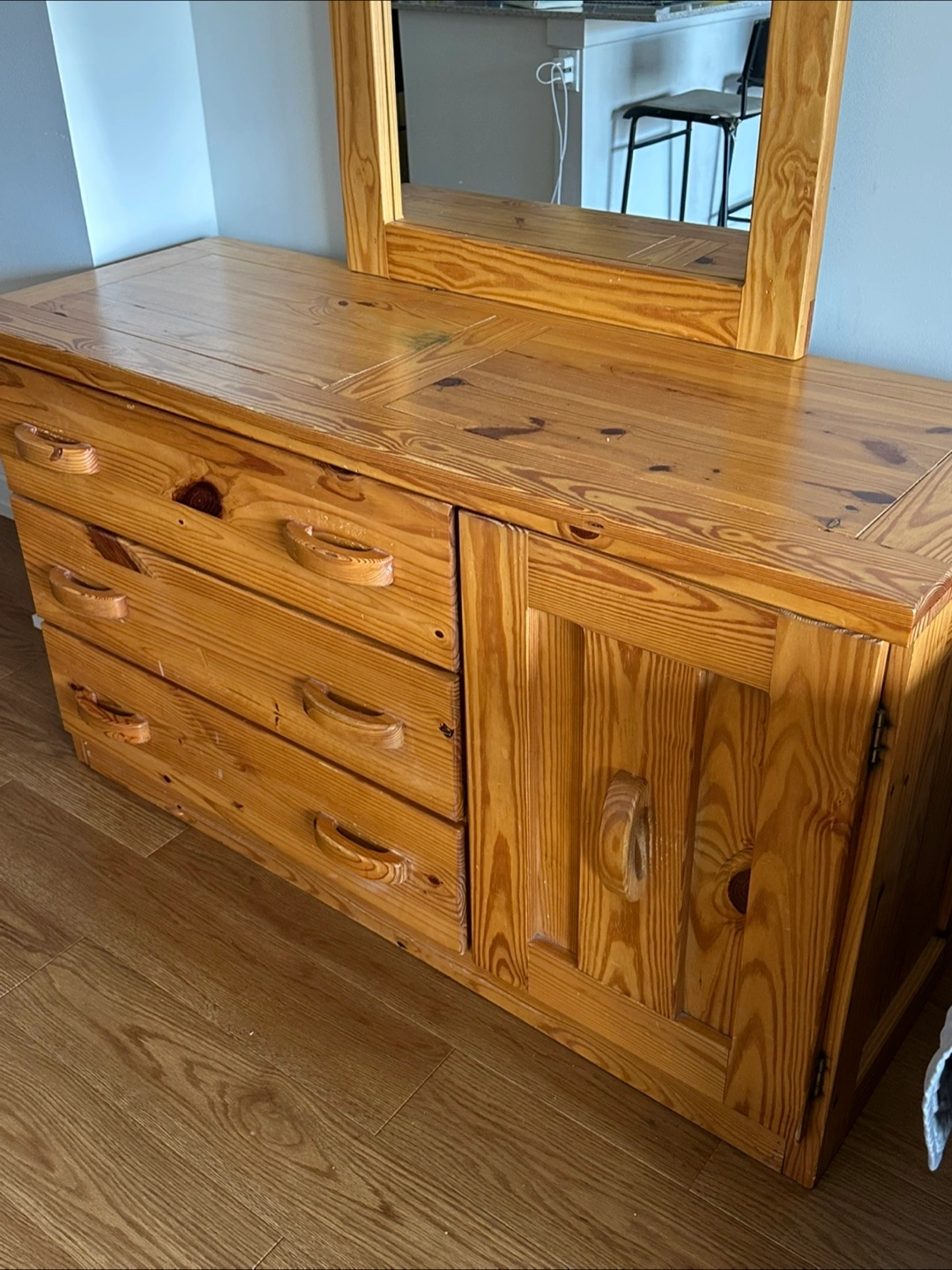 Selling a charming wood dresser with an attached mirror. It features a cabinet and three drawers, perfect for adding storage and a touch of rustic style to any room. It's in good condition and ready for a new home!