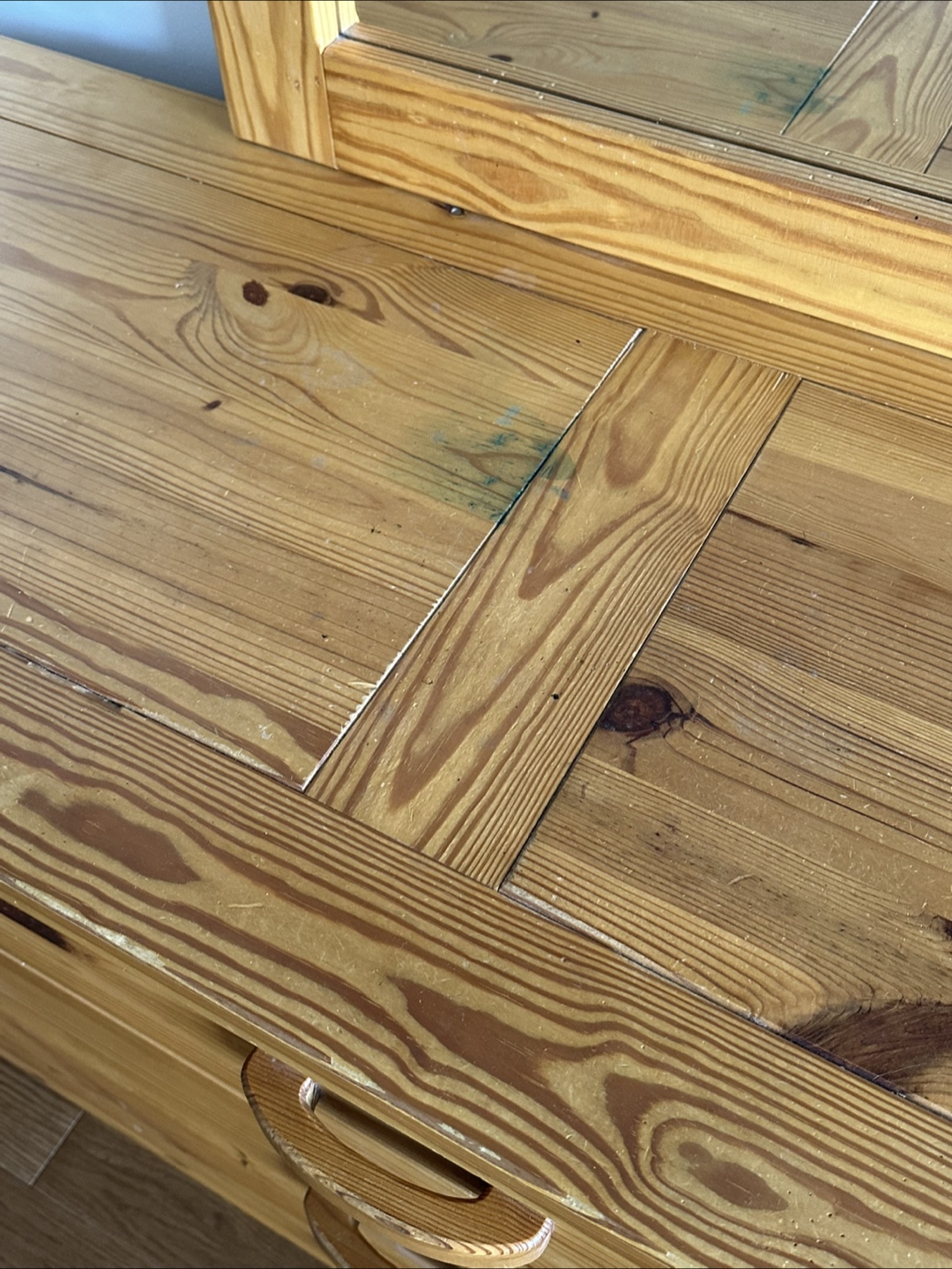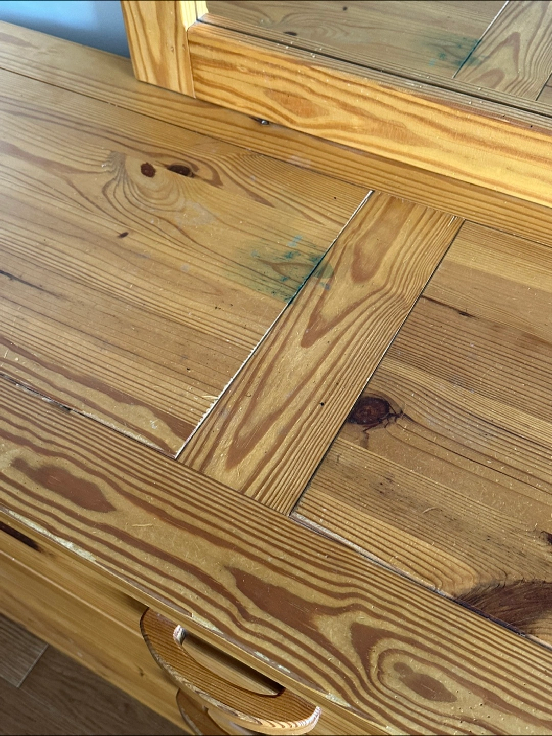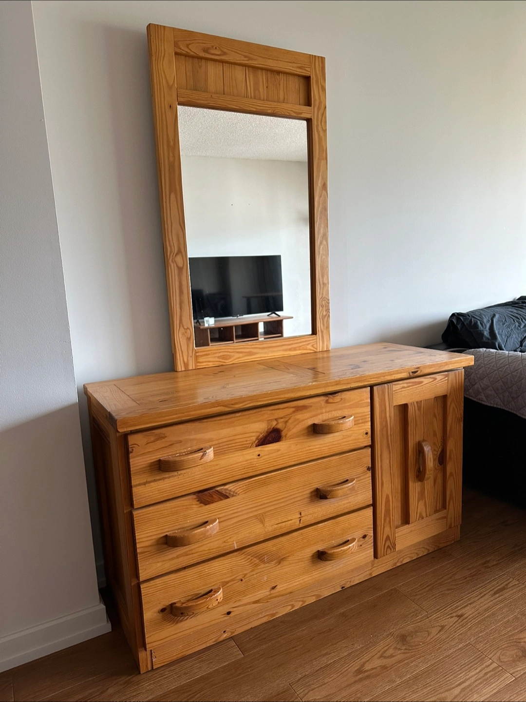Selling a charming wood dresser with an attached mirror. It features a cabinet and three drawers, perfect for adding storage and a touch of rustic style to any room. It's in good condition and ready for a new home!