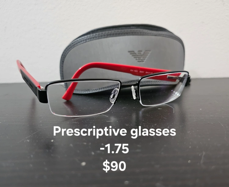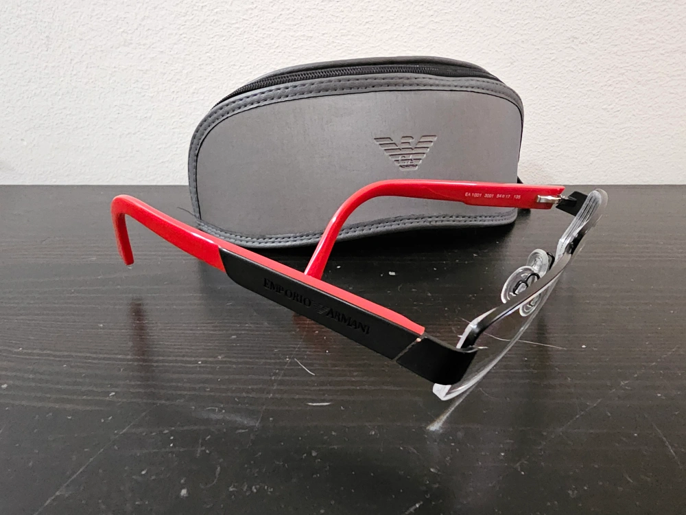 Selling a pair of Emporio Armani prescription glasses, model EA1001. They have a sleek black and red design and come with a case. The prescription is -1.75.
