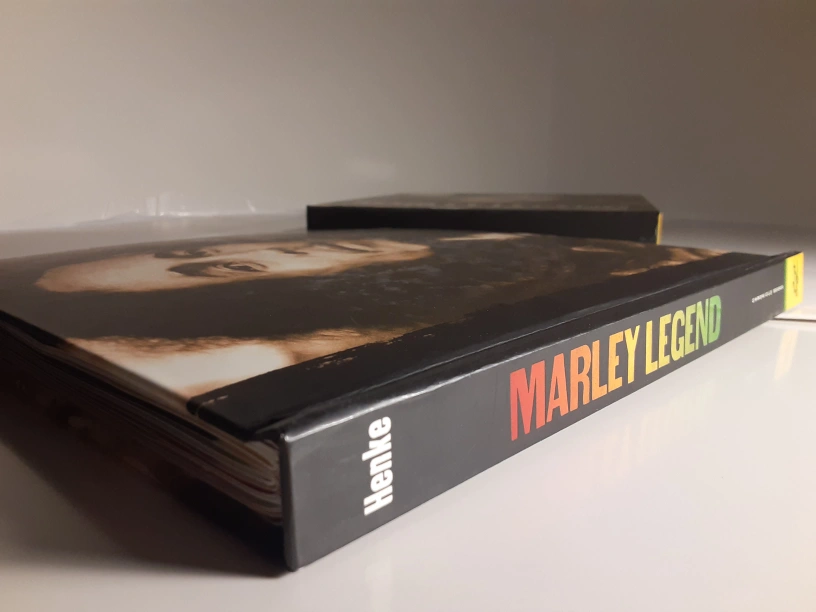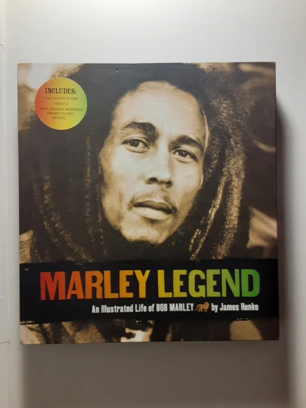 "Marley Legend: An Illustrated Life of Bob Marley" by James Henke. It includes a fully illustrated book and audio CD with rare removable memorabilia, handwritten lyrics, and notes. A great addition for any Bob Marley fan!