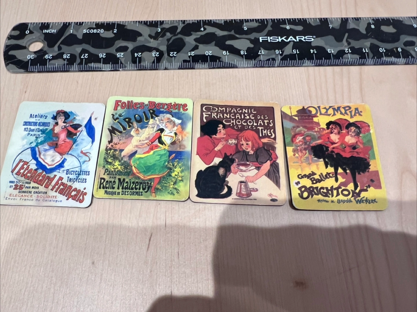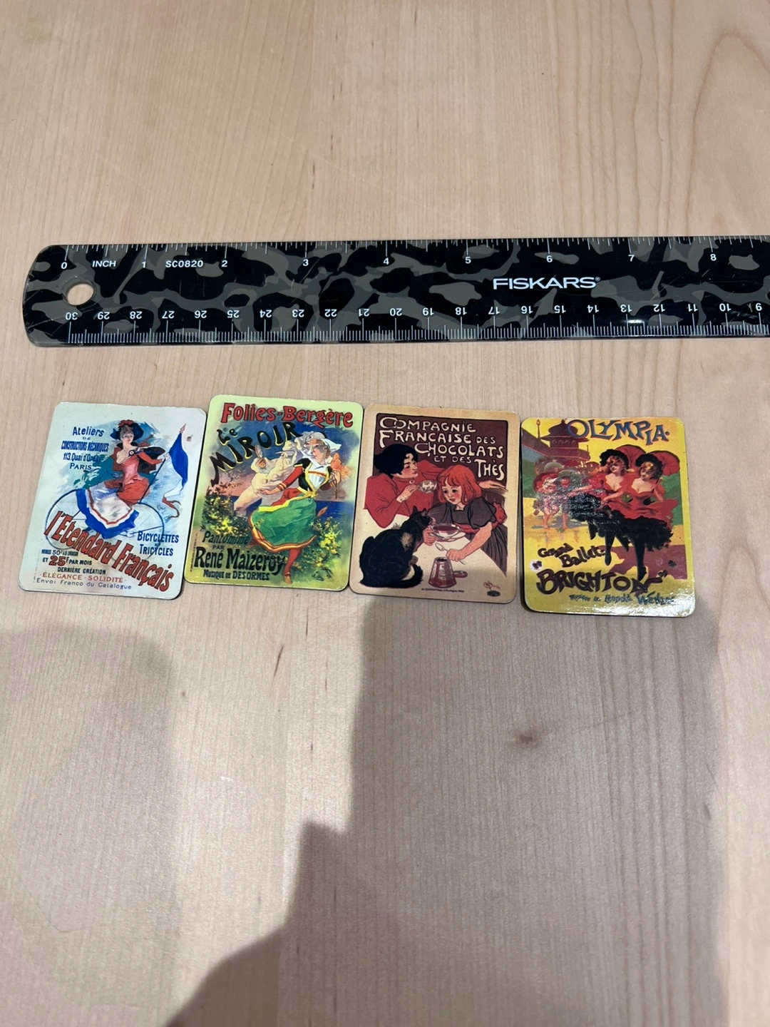 lot of 4 vtg style ADVERTISING MAGNETS - EACH MEASURES 1.75" W x 2.25" LONG - Compagnie Francais Chocolats / Folies Bergere Le Mirror / Ateliers L'Etendard Francais Pairs / Olympia Grand Ballet Brighton - THEY HAVE VINTAGE SCENES - NICE CONDITION - perfect for a retro decor
