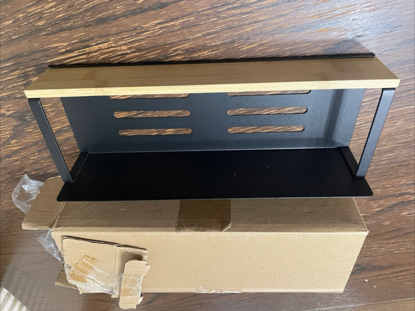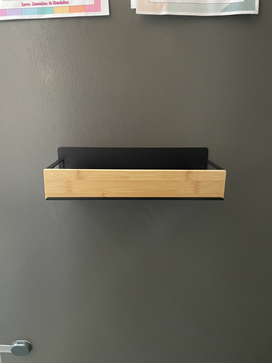 Selling a handy magnetic shelf! It features a combination of black metal and bamboo, giving it a stylish look. The shelf easily attaches to any magnetic surface, making it perfect for the fridge or other metal surfaces. Comes with the original box too!