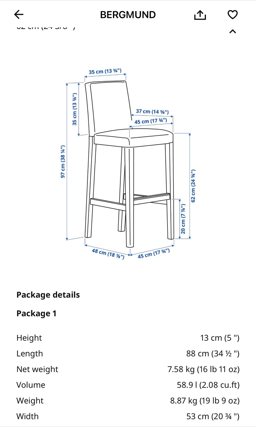 Selling a set of two IKEA Bergmund bar stools in great condition! They feature a stylish grey fabric seat and white legs, perfect for adding a modern touch to your kitchen or bar area. Dimensions are approximately 97cm (38 1/8") tall, 48cm (18 7/8") wide, and 45cm (17 3/4") deep.