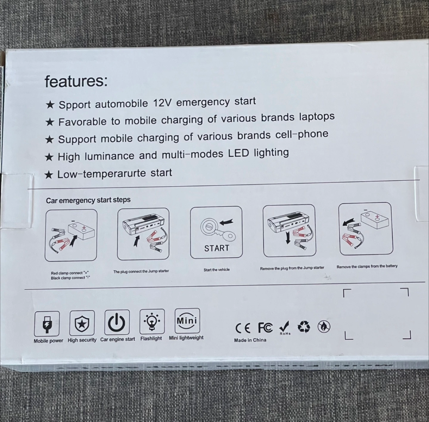 Selling a multi-function jump starter! It's great for car emergency starts, charging digital products, and even has light rescue lighting. It supports automobile 12V emergency starts and is favourable to mobile charging of various brands of laptops and cellphones. It also features high luminance and multi-modes LED lighting and low-temperature start. This jump starter is mobile, offers high security, car engine start, flashlight, and is mini lightweight
