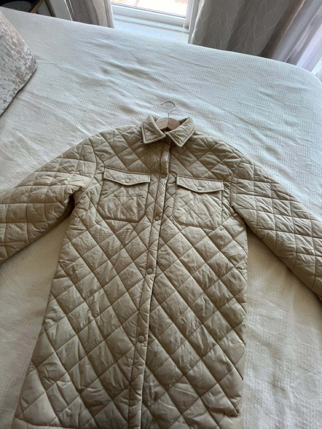 Selling a SHEIN quilted jacket (slightly overlarge) in a lovely beige color! It's in great condition and ready for a new home. Perfect for adding a touch of warmth and style to your outfits