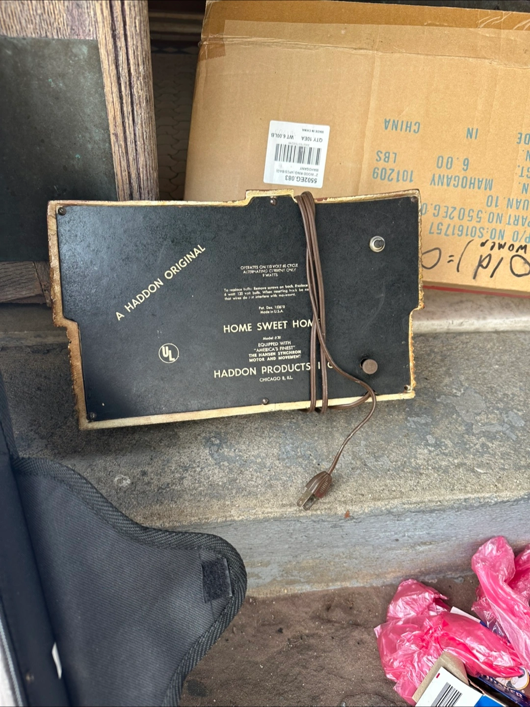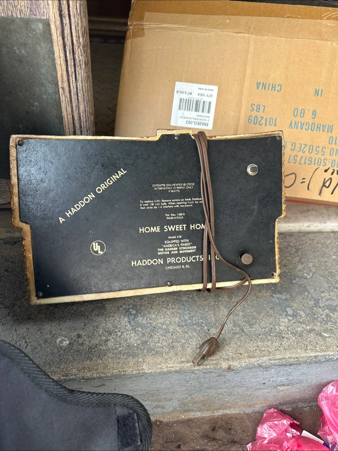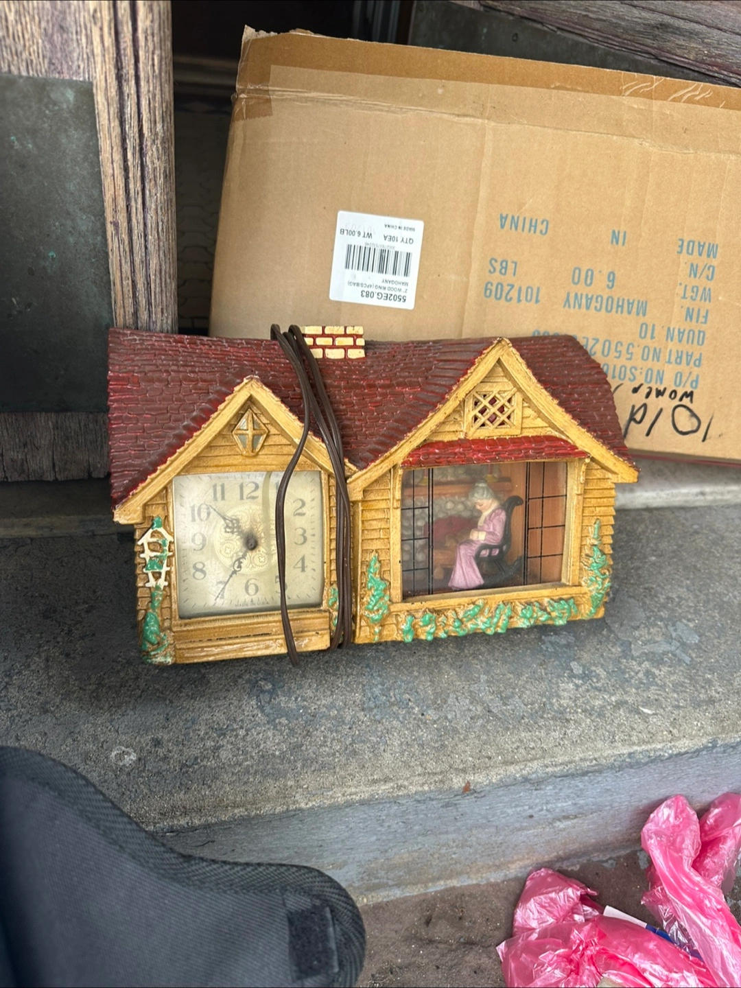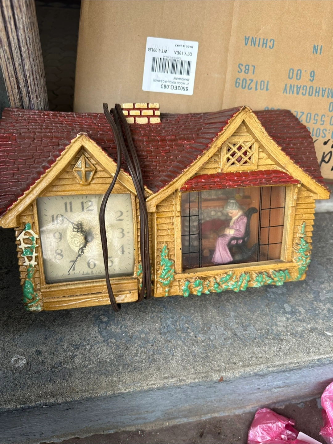 Selling a Haddon Original 'Home Sweet Home' clock. It's a charming piece, shaped like a cozy house with a clock on one side and a sweet scene on the other. Perfect for adding a vintage touch to any room!