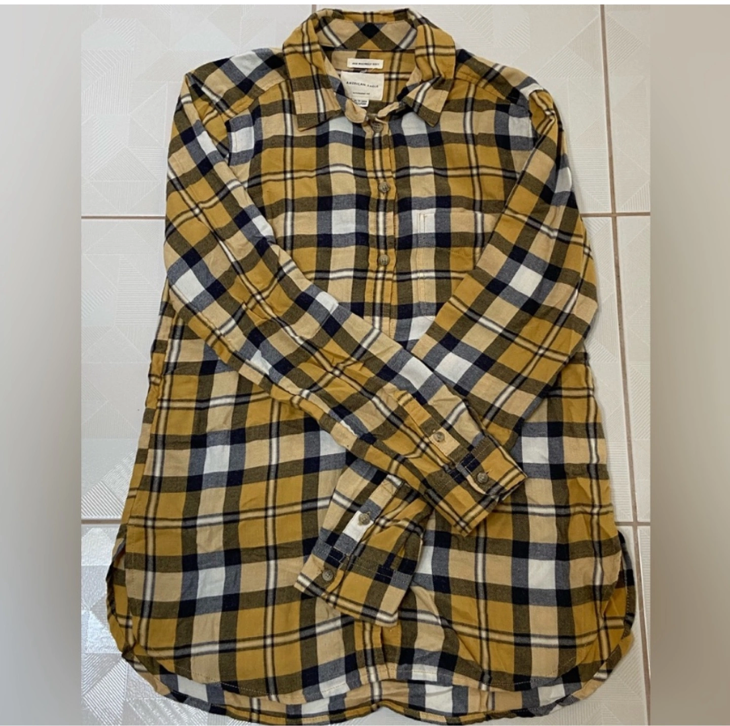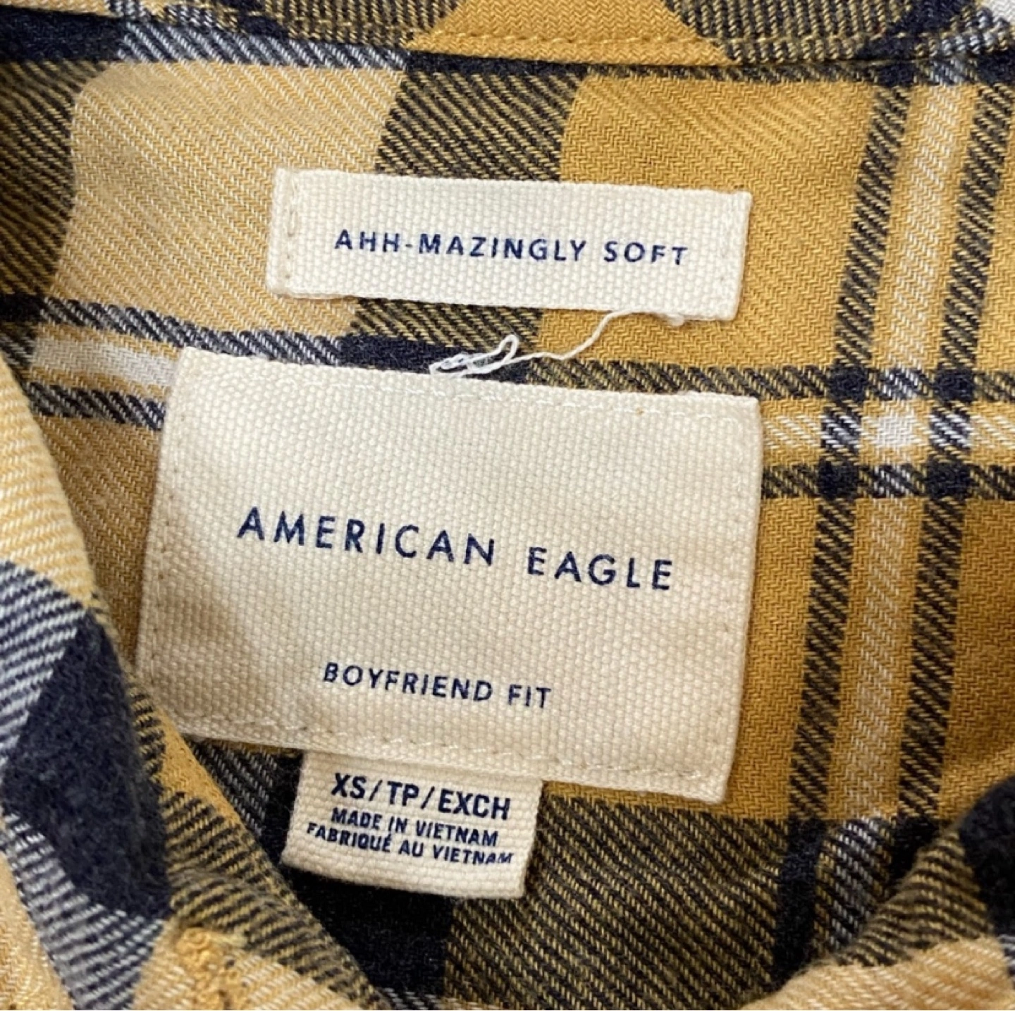 Cozy American Eagle flannel shirt in a yellow plaid pattern! It's an XS and has a relaxed, boyfriend fit. Super soft and comfy for layering. Amazing to throw on to any casual outfit