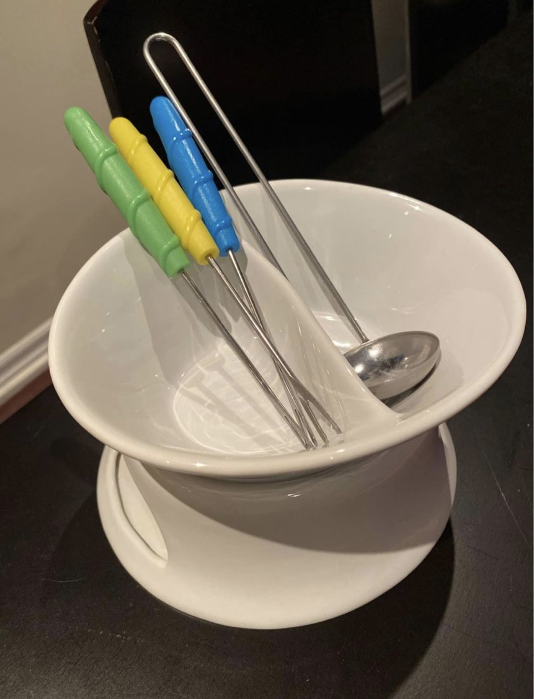 Includes 3 steel fondue forks and one steel ladle.