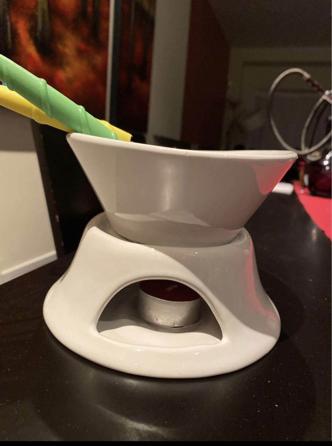 Dual fondue set to melt both cheese and chocolate at the same time! Uses heat from 2 tea light candles. Never used.