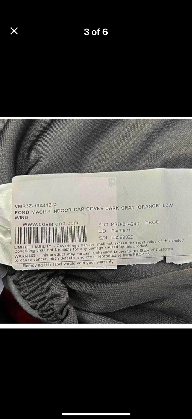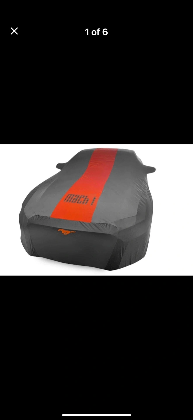 Selling a Ford Mustang Mach 1 indoor car cover in dark grey with orange stripes. It's designed for the low wing model. This cover is brand new and ready to protect your ride!