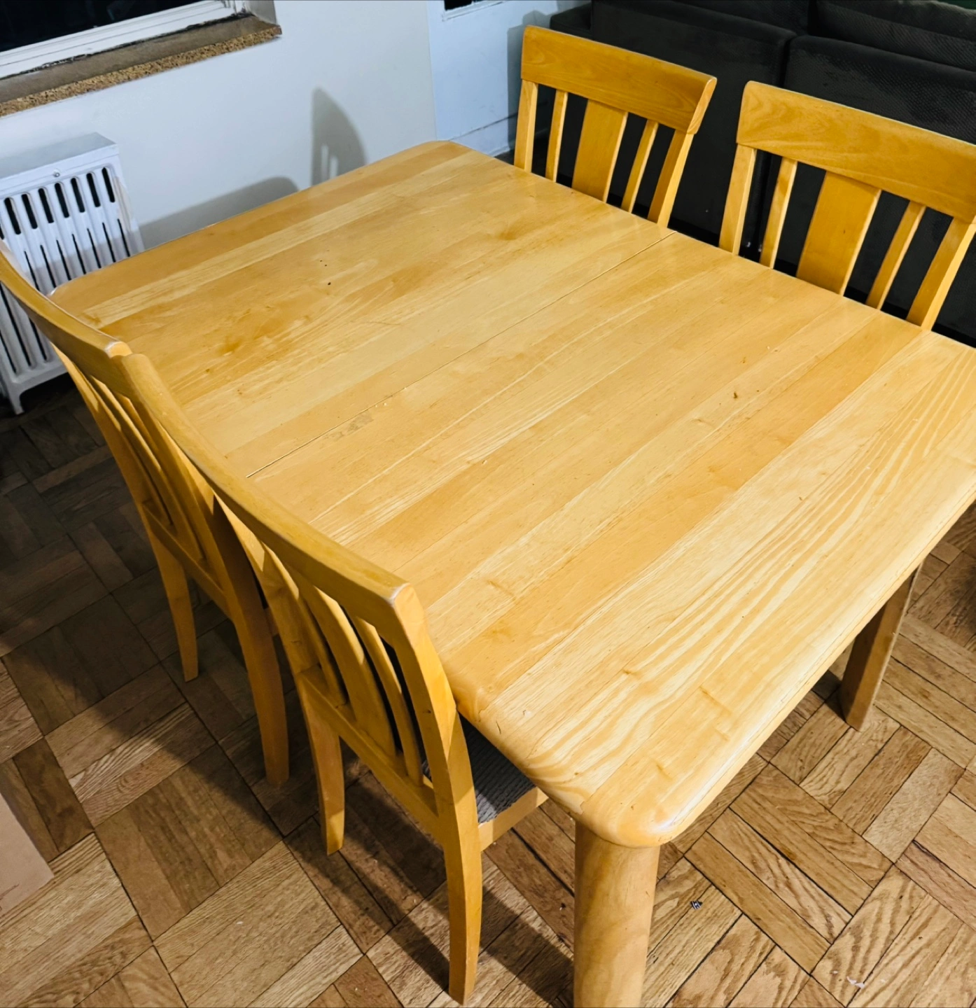 Selling a wooden dining table with four matching chairs. The set is in good condition and perfect for a small family or apartment. The light wood finish gives it a warm and inviting feel. A great addition to any dining space!