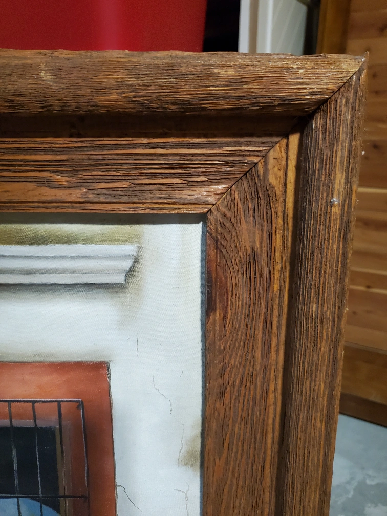 Purchased in Mexico. Lovely painting by Rafael Zamora Castro! It features a window with flowers and greenery, framed in a rustic wooden frame. It's a beautiful piece to add some charm to your home.