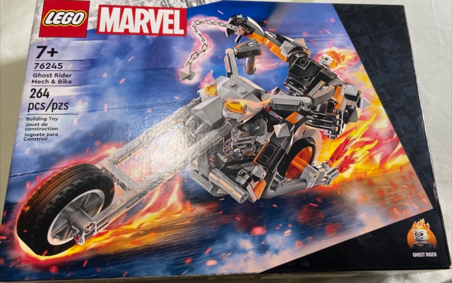 Selling a LEGO Marvel Ghost Rider Mech & Bike set (76245)! It's suitable for ages 7+. This building toy has 264 pieces. Get ready for some exciting construction and play! Sealed brand new