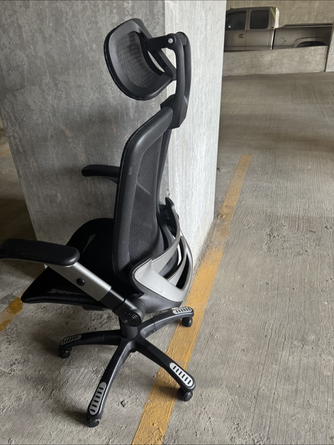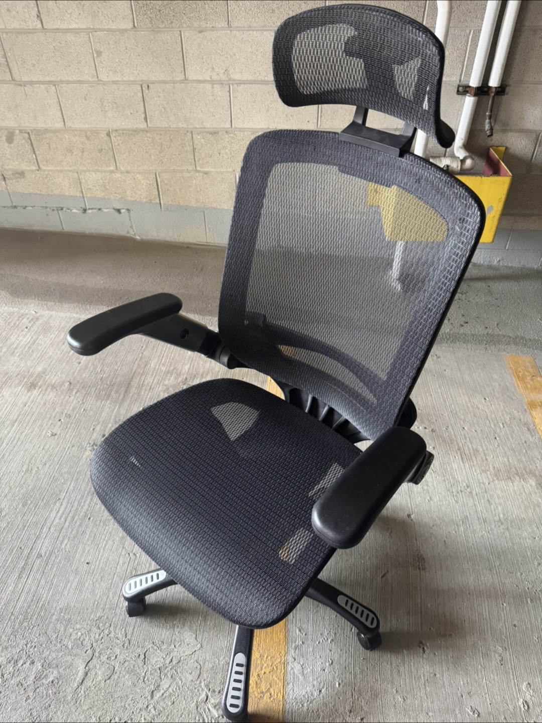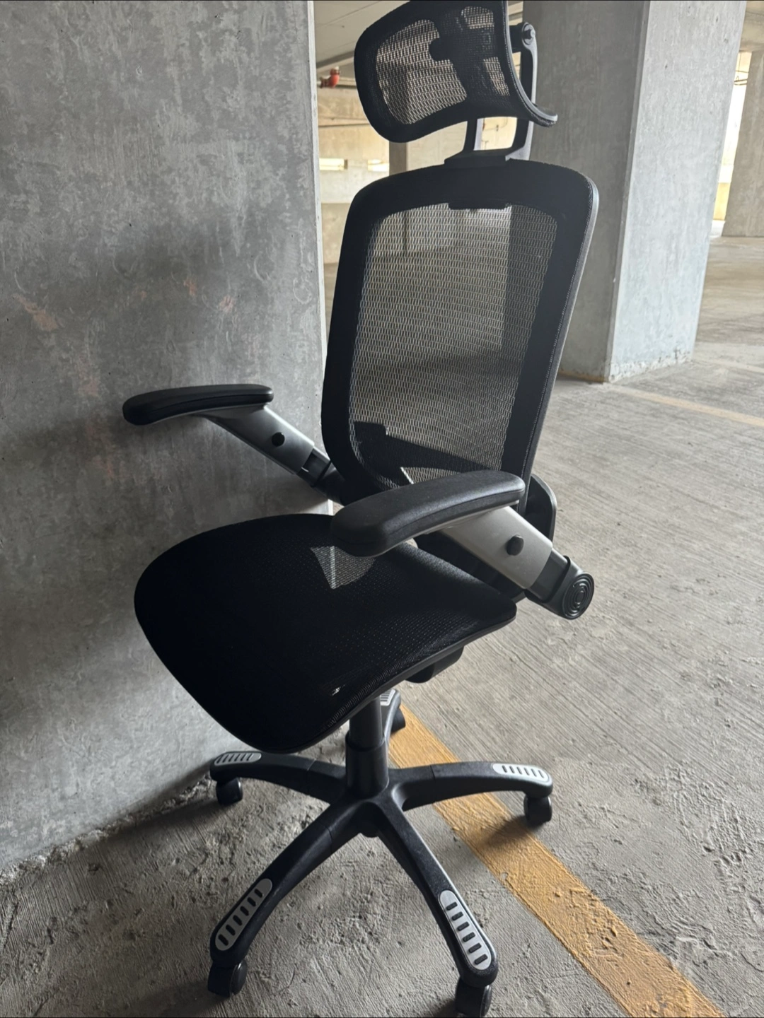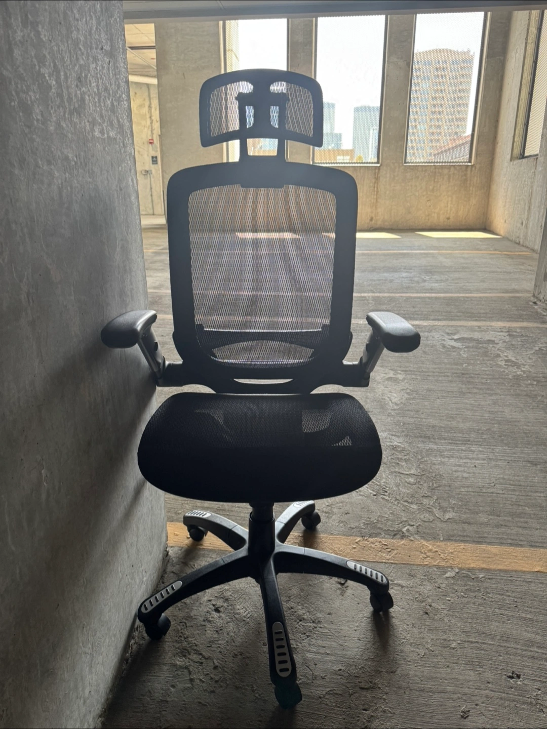 Selling a comfortable ergonomic office chair. It features a breathable black mesh back and adjustable armrests. Great for long hours at your desk!