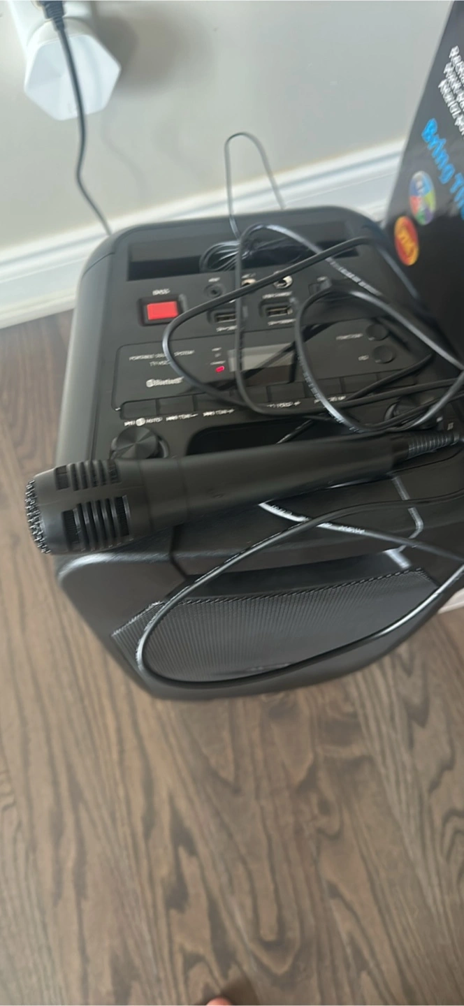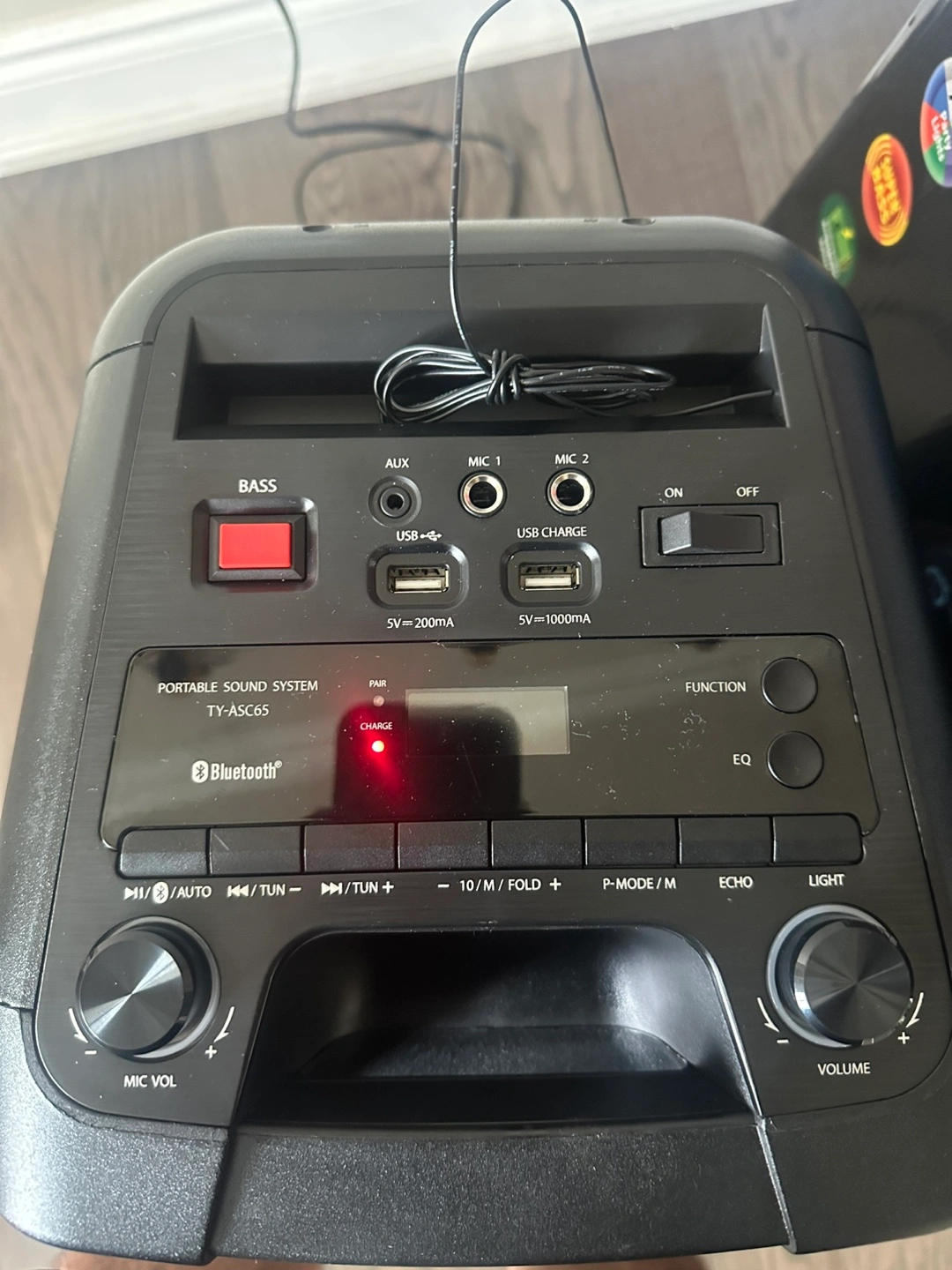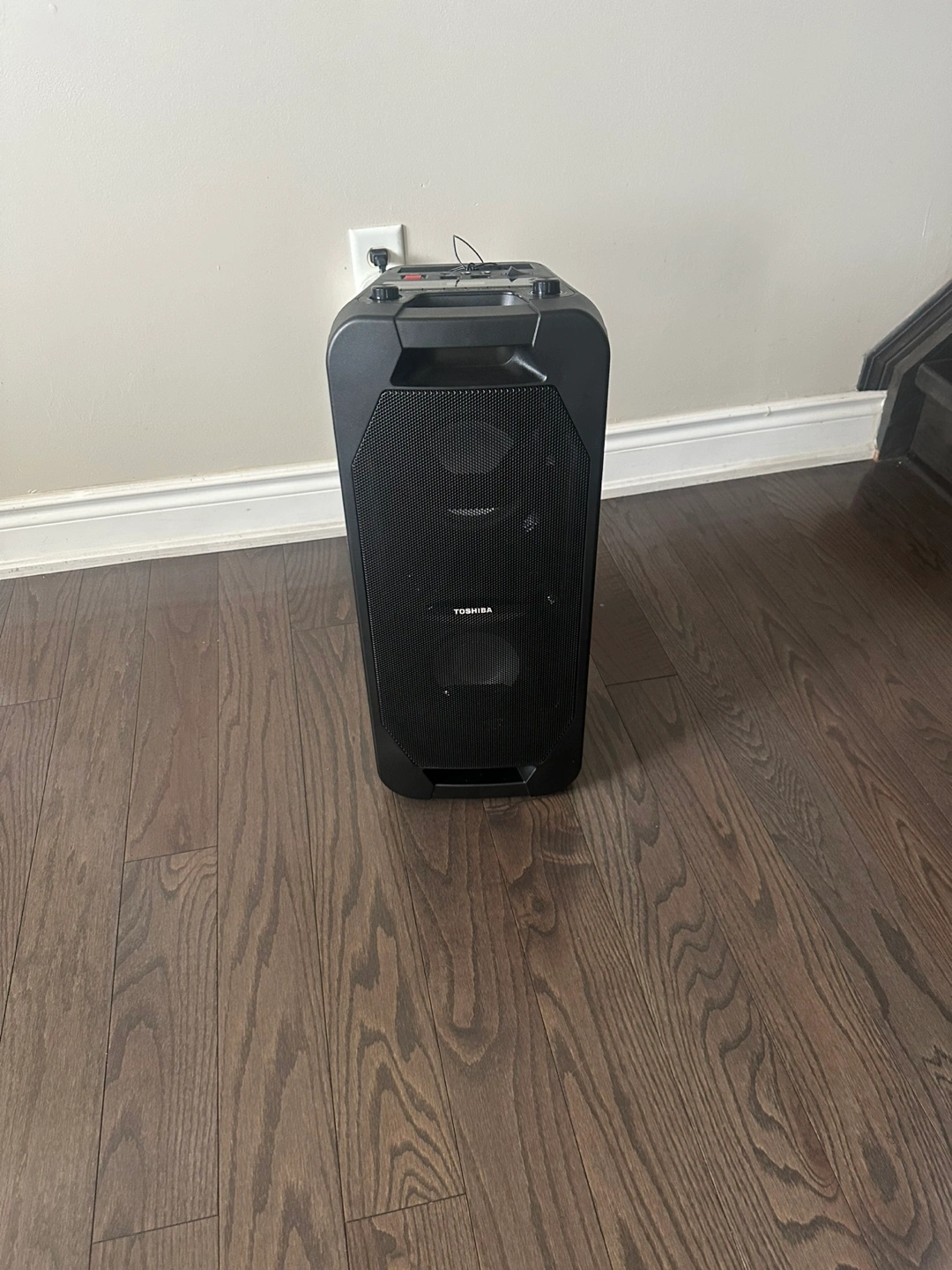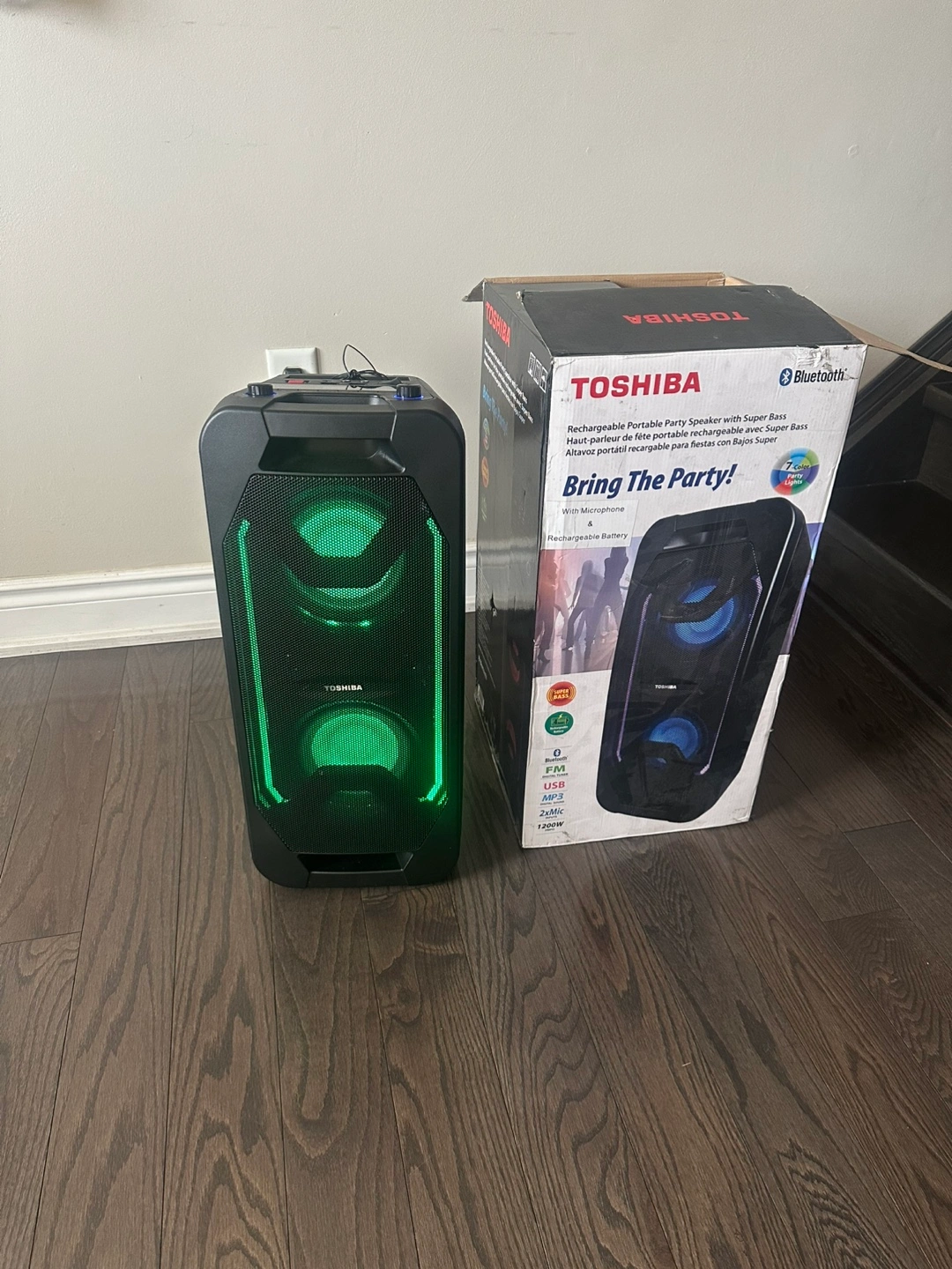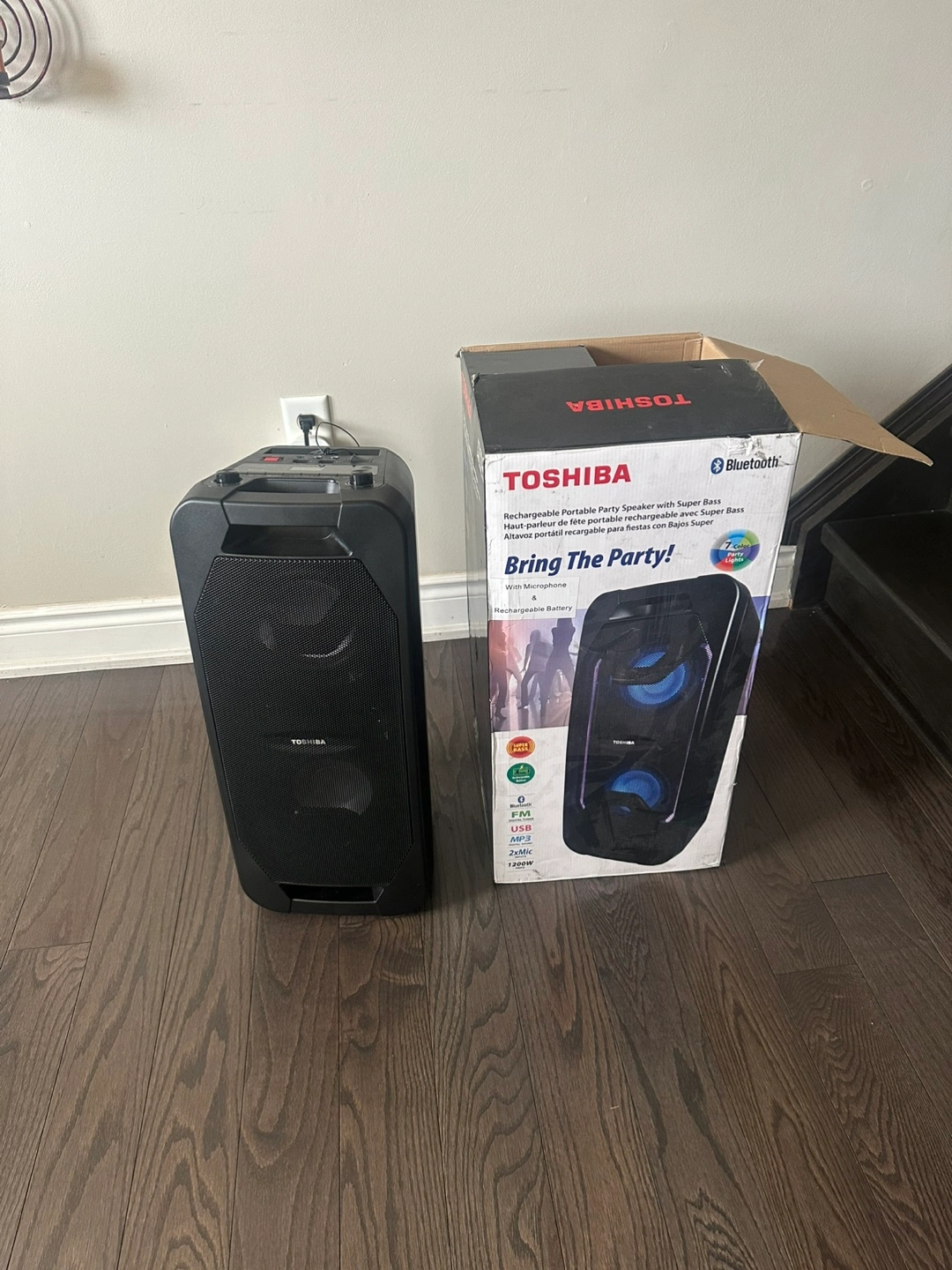 Selling a Toshiba portable party speaker, model TY-ASC65. It comes with a microphone so you can bring the party! The speaker has super bass and Bluetooth connectivity. It also has a rechargeable battery. The box is included
