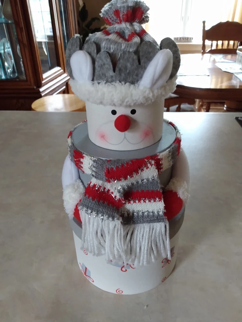 Selling a cute snowman hat box! It's in great condition and perfect for storing candies, cookies , chocolate The box is decorated with a snowman face and a festive scarf. It would be a nice addition to your home decor during the holidays!