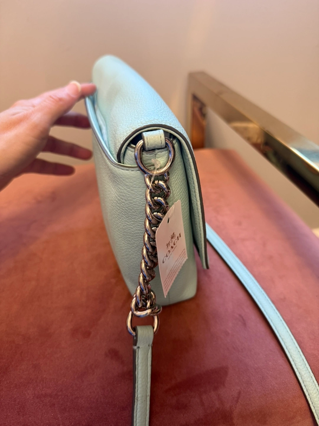 Selling a New Coach Crosstown Xbody bag in a beautiful light blue/mint colour called Seaglass. The bag features a stylish chain strap and the classic Coach design.