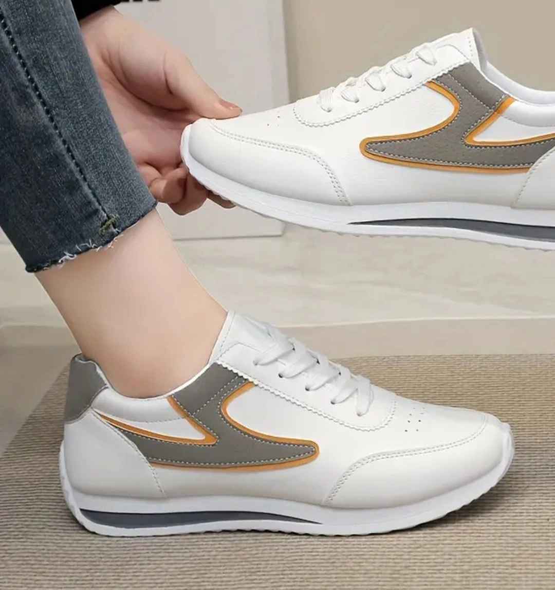 Selling a pair of white fashion sneakers in size 7.5. They feature a stylish design with grey and orange accents. These sneakers are perfect for everyday wear and are in great condition!