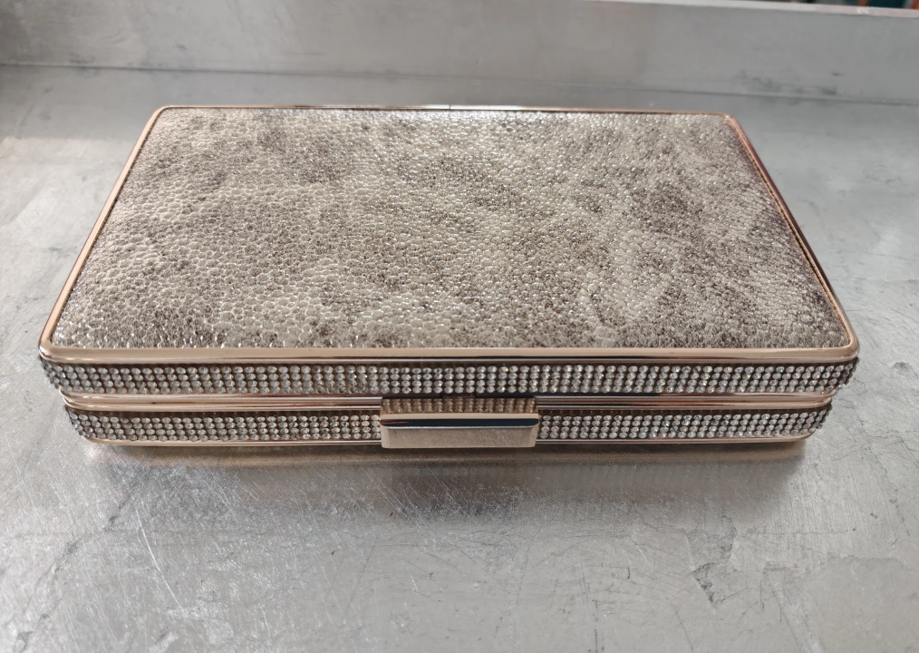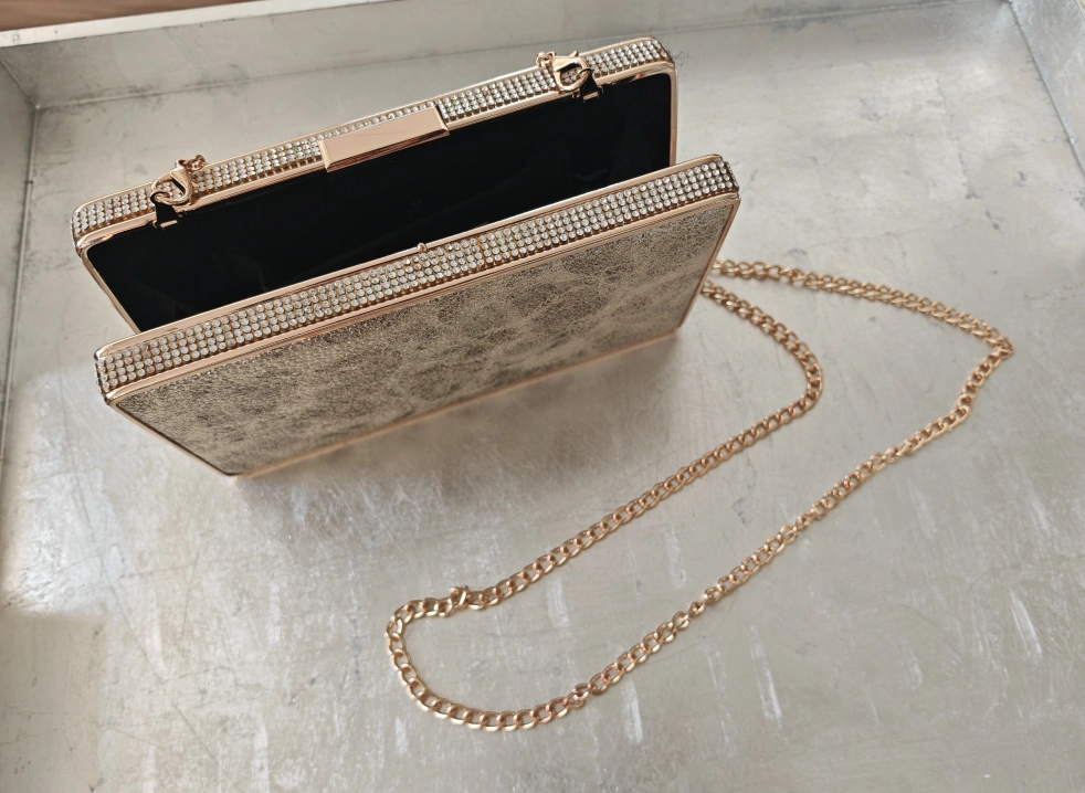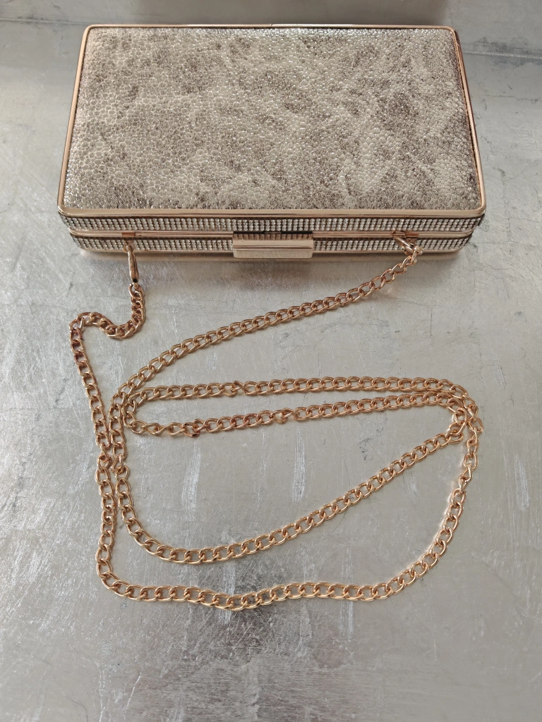 Selling a stylish clutch evening bag! It features a beautiful design with rhinestones and comes with a gold-tone chain strap. Perfect for a night out or special occasion.