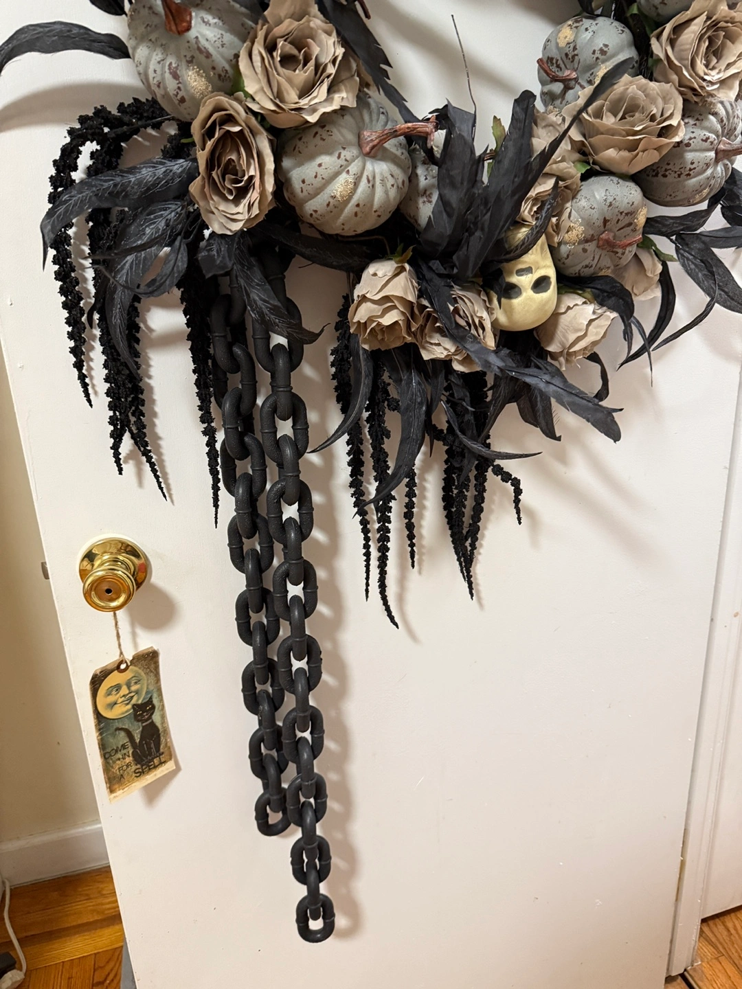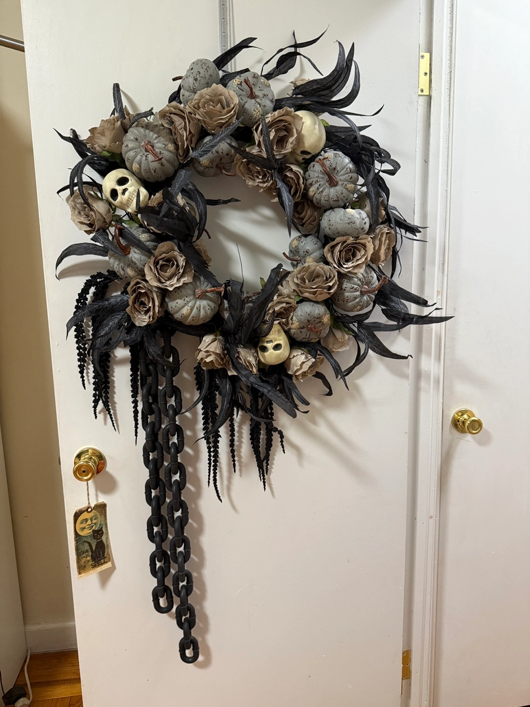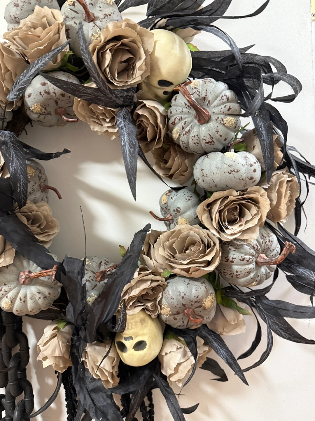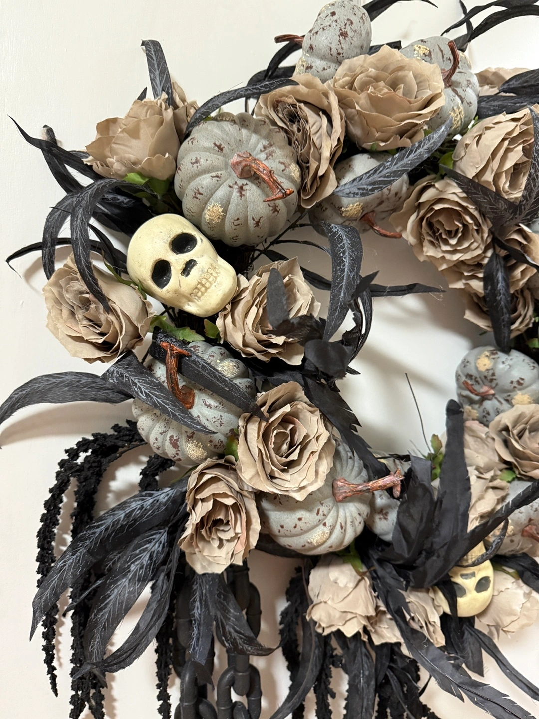 Selling a spooky and stylish Halloween wreath! It features a mix of pumpkins, roses, and skull accents, perfect for adding a festive touch to your door or wall this Halloween season. The wreath also has a black chain accent.