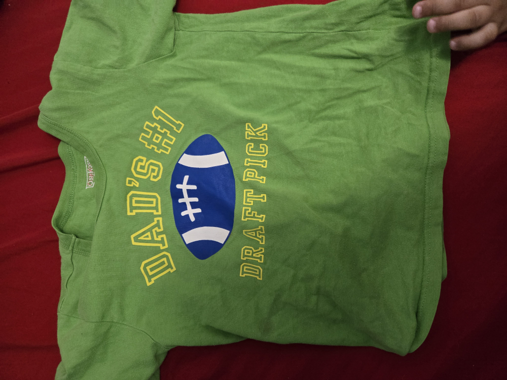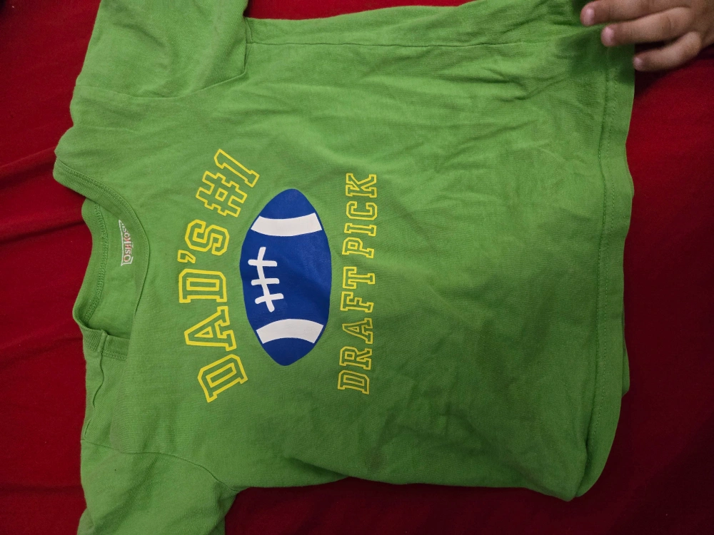 Selling a cute green t-shirt from OshKosh B'Gosh! It has a fun football design that says 'Dad's #1 Draft Pick'. Perfect for your little one!